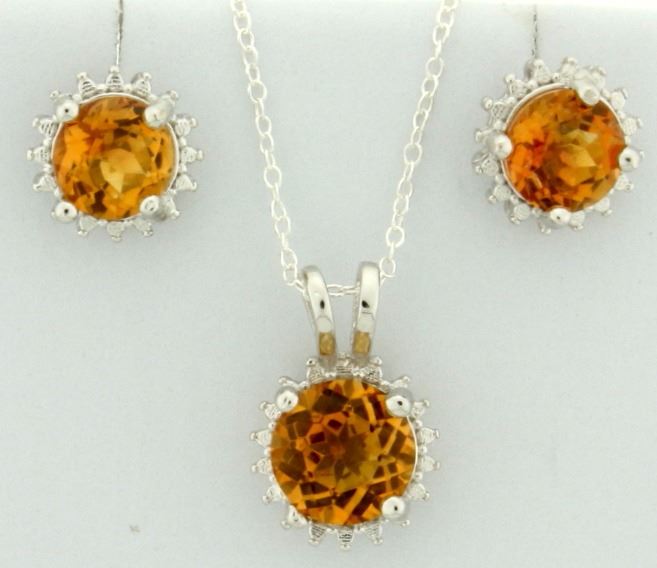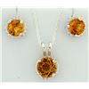 Genuine 2.7ctw Citrine gemstone earring and pendant set with deep orange/yellow color gemstones (6mm earrings, 7mm pendant) set in Platinum over Sterling Silver. 18" Sterling chain and friction backs included. 3.6g