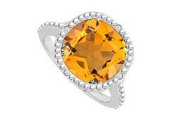 A larger prong-set square citrine in the center & is surrounded by small gold beads along with four brilliant-cut diamonds sparkling in the middle of the square side between gold beads. Other smaller gold beads adorn both sides.. This gorgeous ring is made in 10K white gold & has a total gem weight (TGW) of 2.05 carats.