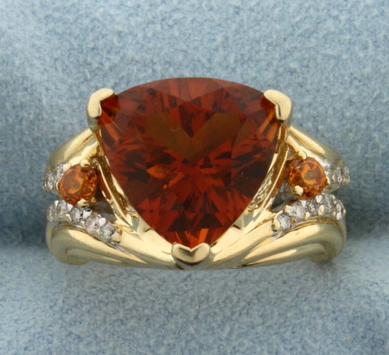 In 14K Yellow Gold. Contains a 5ct very high quality natural Citrine gemstone with orange-yellow color and excellent clarity. Also contains two 3mm round natural Citrine gemstones and sixteen high quality .01ct Diamonds, SI clarity/H color. Size 6 1/4. 8.4g