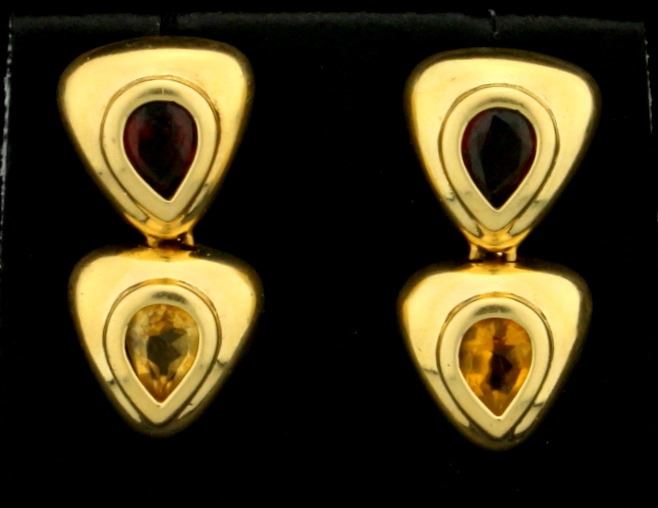 In 14k yellow gold, containing a 6 1/2x5mm citrine and garnet pear shaped gemstone in each earring. 1 inch long each. With Friction Backs. 6.4g.