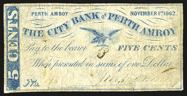 New Jersey. 5 Cents, blue. Eagle at center. Very Good, date tone.