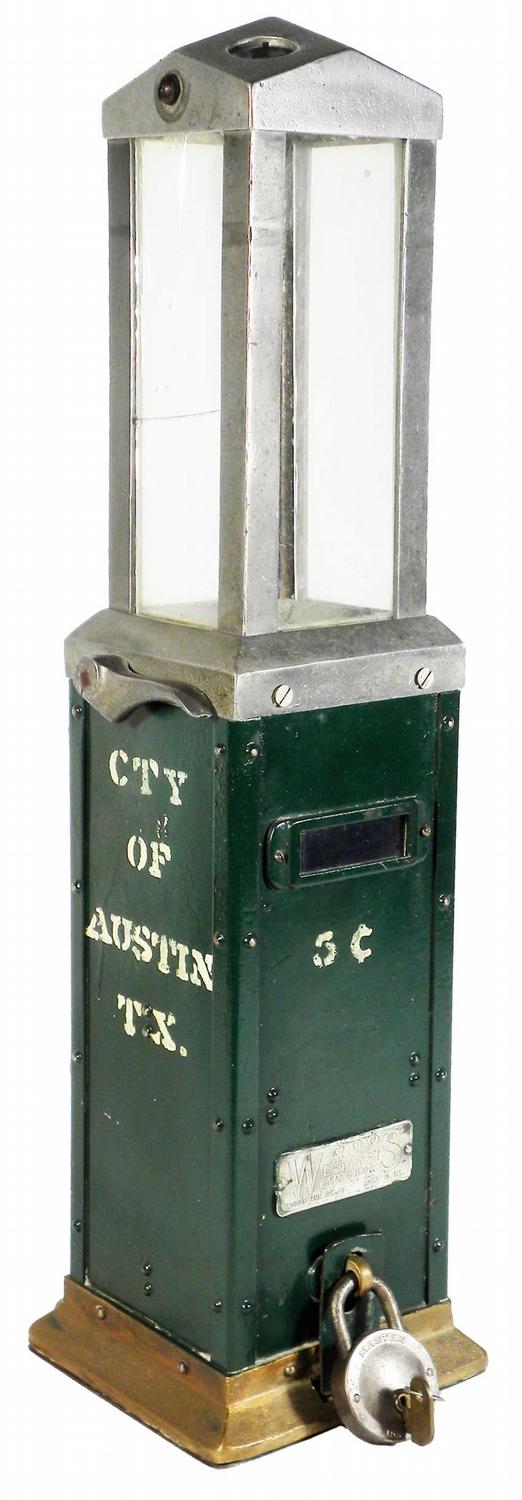 City Bus 5 Cent Token Receiver. City of Austin, TX. "Colored to the back of bus". Made by Woods Fare Box Company. Very good original condition, comes with padlock and key. 24 inches tall.