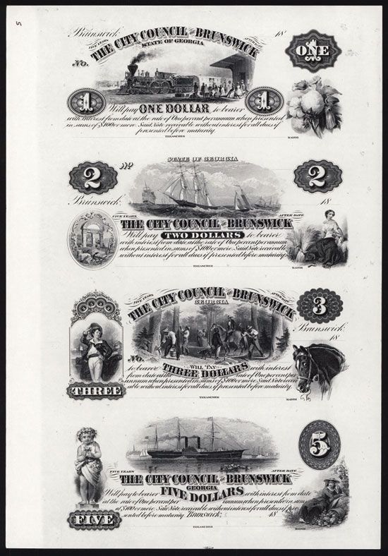 Brunswick, Georgia, Uncut sheet of 4 notes, 18xx (originally printed in 1850-60's, these are ca.1960-70's), $1-$2-$3-$5, (Haxby Unlisted), Printed without green border and underprint, only black printing of vignettes, titles and text, Modern ÒProprietary ProofÓ, Black printing without border or underprint printed on thin white card, CU to Gem Uncirculated condition. ABNC. Rare as uncut sheet. (ABN Commemoratives, AIA XI, May 15, 2012)