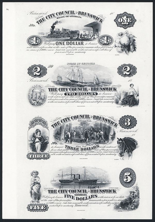 Brunswick, Georgia, Uncut sheet of 4 notes, 18xx (originally printed in 1850-60's, these are ca.1960-70's), $1-$2-$3-$5, (Haxby Unlisted), Printed without green border and underprint, only black printing of vignettes, titles and text, Modern "Proprietary Proof", Black printing without border or underprint printed on thin white card, CU to Gem Uncirculated condition. ABNC. Rare as uncut sheet. (ABN Commemoratives, AIA XI, May 15, 2012)