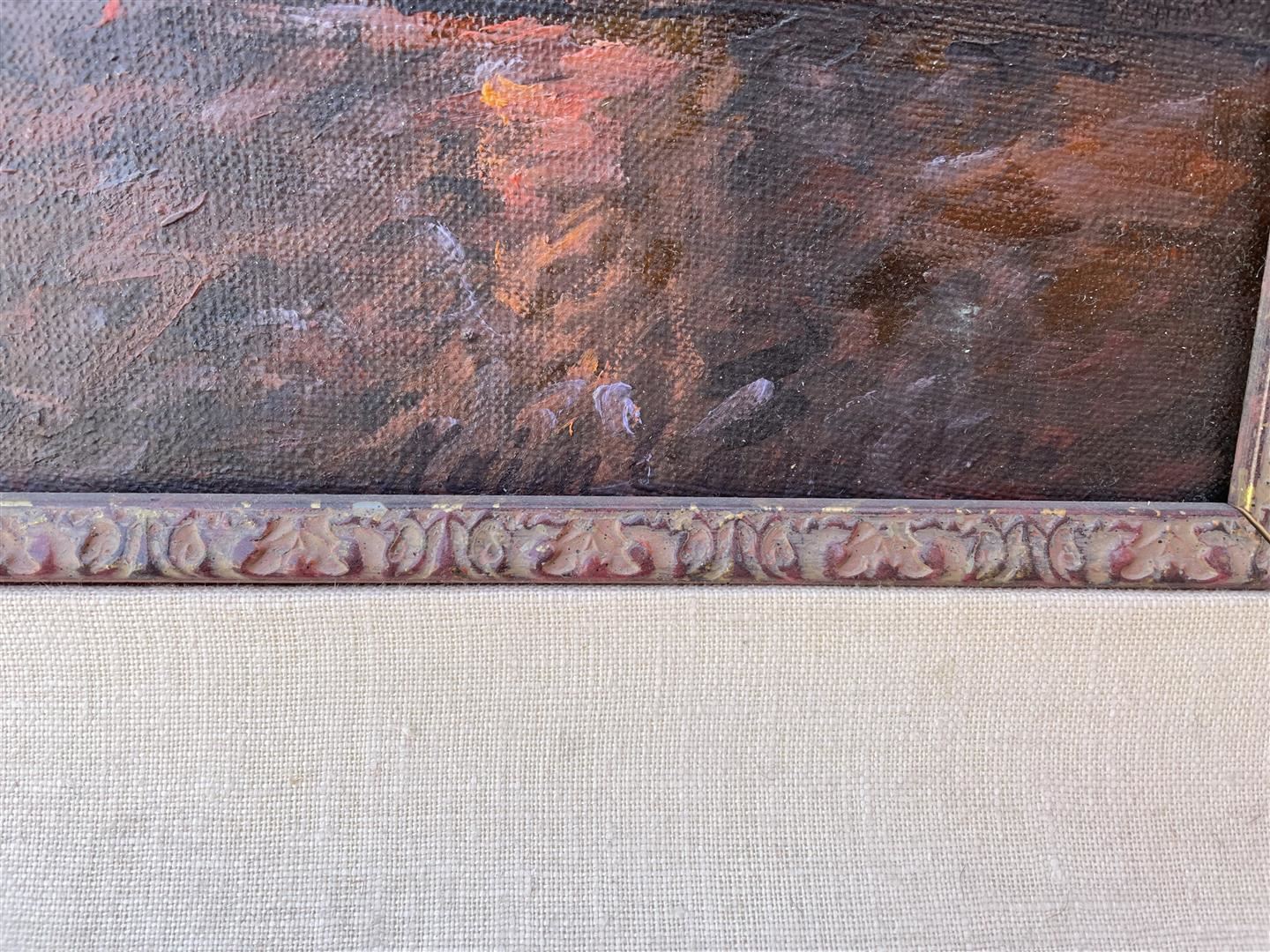 Three white horses pull a carriage of people through a crowded city street in this Impressionistic oil on canvas by Naim Lamidov. The painting measures 19.625 x 23.625; framed image measures approx. 31.625 x 35.625.