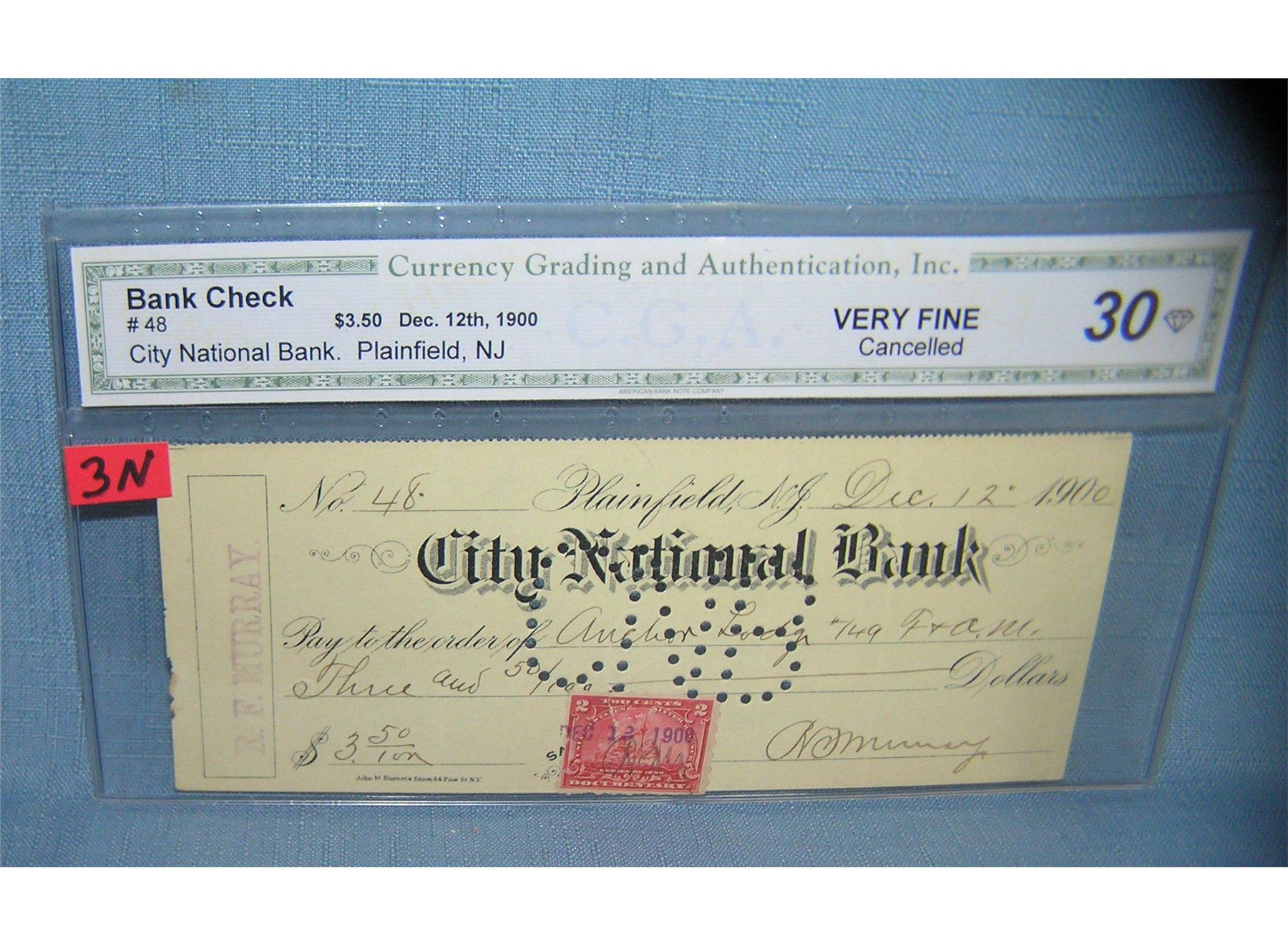 City National Bank bank check of Plainfield NJ with day of issue postage stamp both dated December 12, 1900 graded very fine condition est. value $50.00-$60.00