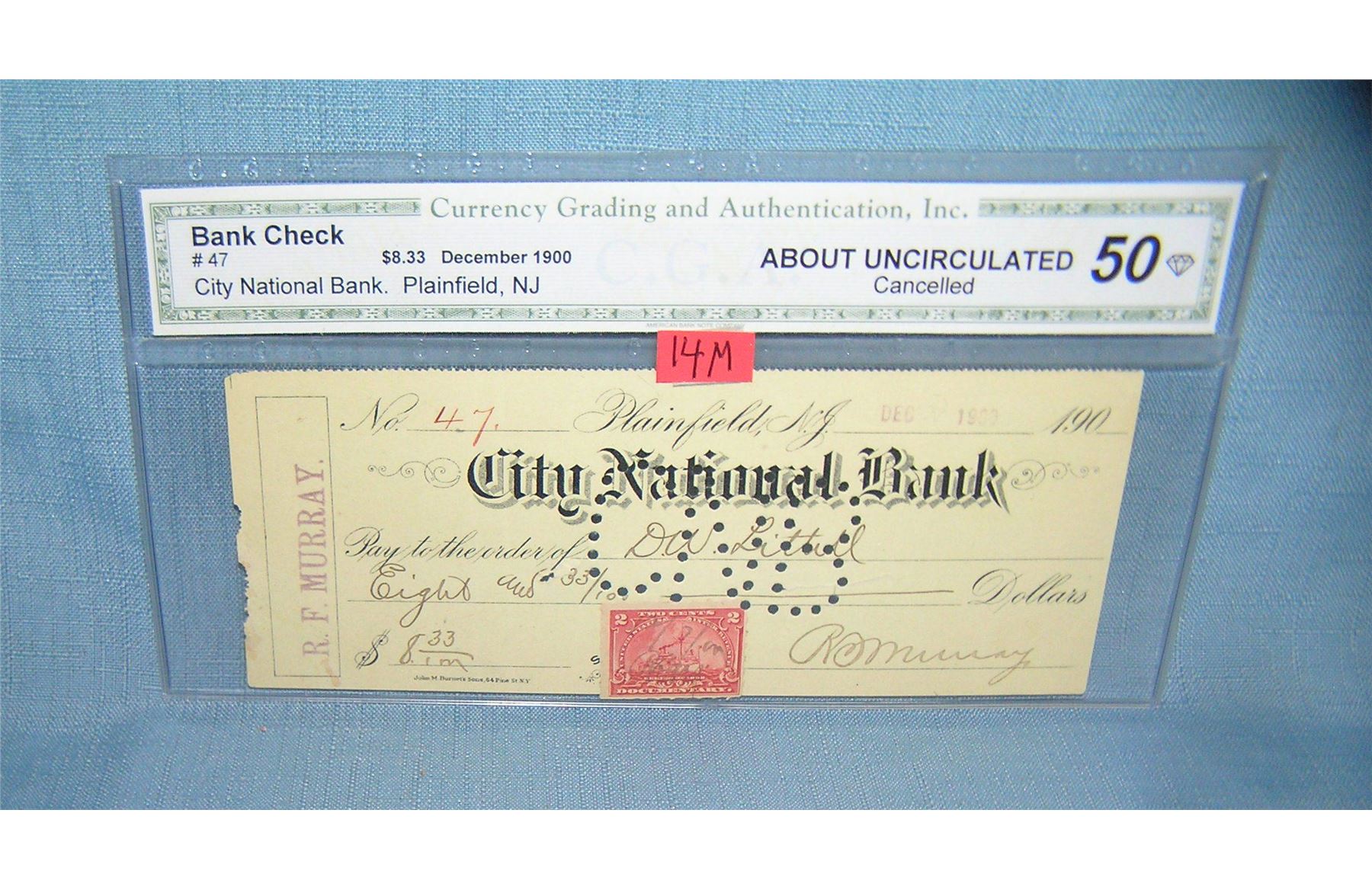 City National bank of Plainfield NJ bank check with period 2 cent stamp dated December 1900 graded about uncirculated est. value $40.00-$50.00