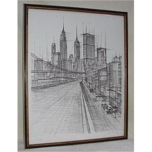 A large framed print of a city skyline with bridges and highway, 25 /2''X 31 1/2'', could be New York. A companion piece to # 3469, black and gold frame, Paper label on back reads: New York frame & picture Co. 29 John Street, N.Y. Signed as shown.