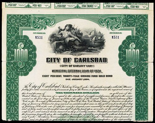 Czech-Slovakia, 1924, $1000, Municipal External Loan of 1924 8% 30 Year Sinking Fund Gold Issued Bond, #M531, Black on green border and underprint, Reclined allegorical woman top center with cherub and white doves at fruit bowl, Fine condition with toning and splitting at horizontal folds, HBNC. Red Stamp center reads “The holder of this Bond accepts the terms of the Offer of the City of Karlovy Vary (Carlsbad) dated December 31st, 1946 which terms include guarantee by the Czechoslovak State with respect to payment of interest, amortization, and principal, reduction of interest to four per cent per annum beginning with the coupon dated 1st January 1947, and extension of maturity of the Bond to 1st January 1966. “ Speculative bond.