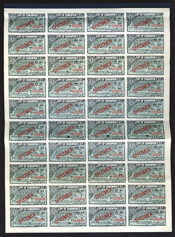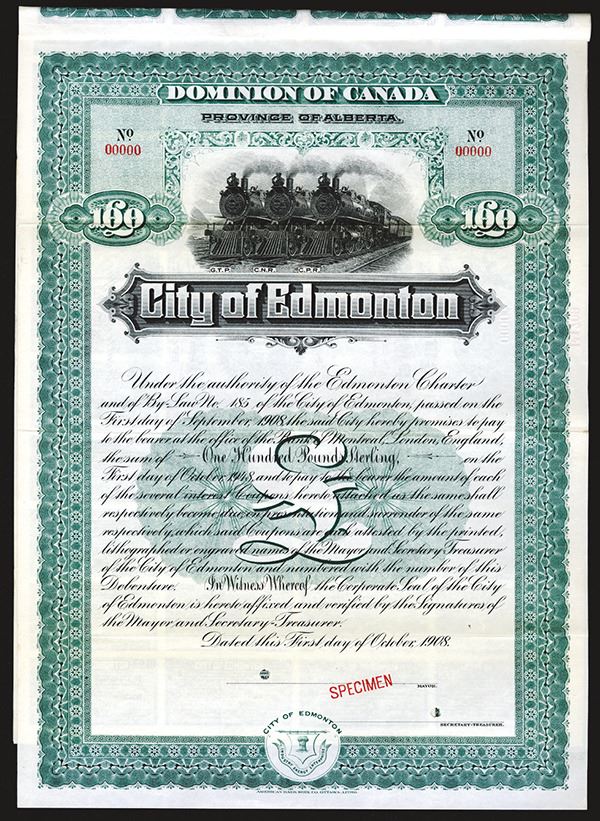 Canada. Alberta. 100 Pounds Coupon Bond Specimen. Three locomotives at top. ABNC. Ottawa. Litho. VF+