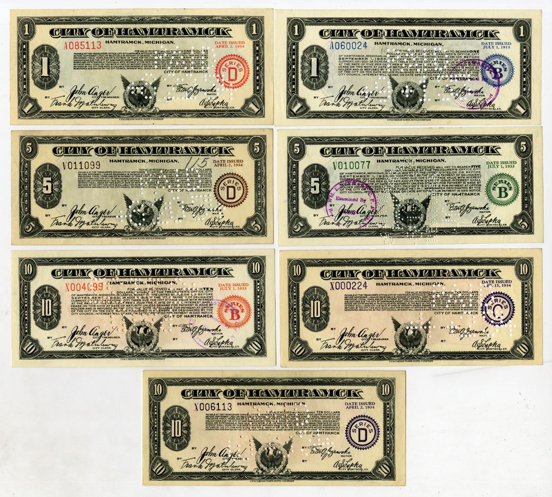 Hamtramck, Michigan......, 1933-34. Lot of 7, I/C Depression Scrip, Includes: $1, Series B & Series D; $5, Series B & Series D; $10, Series B, Series C, & Series D. Notes are in XF to Uncirculated or better condition. (7). Sold "AS IS" no returns accepted.