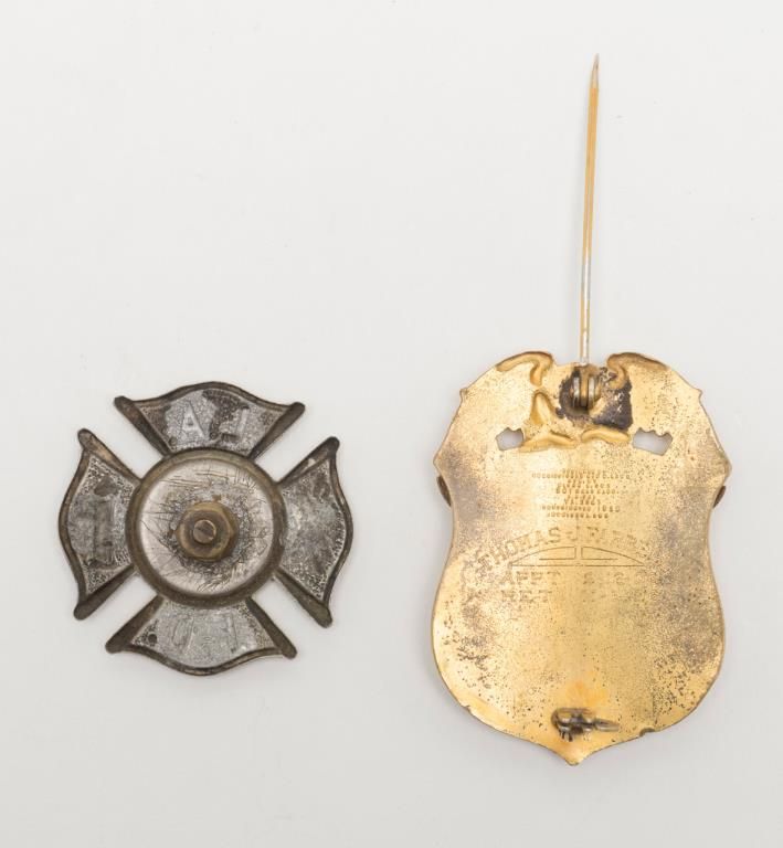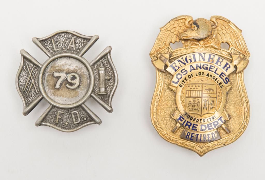 City of LA Fire Dept. Retired Engineer badge and L.A.F.D. #79 cap badge. Est.: $150-$300.