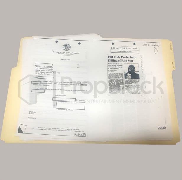 Police folder used in the production of the 2018 drama film City of Lies. This manilla folder features various paperwork, measuring 8.5" x 11", all with printed black text and images. This piece remains in excellent, production used condition.