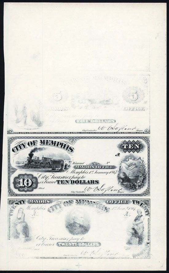 Memphis, Tennessee. Lot of 4 notes (uncut sheet of 4) of full black printing on the $10 note and partial lighter printing of the $20, the $5 notes are ghost printing, all without underprint, Originally printed in 1866-67 (ca.1960-70's), $5-5-10-20, (Haxby Unlisted), Modern ÒProprietary ProofsÓ. The $10 note has locomotive at station on top left with Tennessee arms on lower right; The $20 note has portrait of military man in uniform flanked by allegorical female holding sheaves on left and blacksmith on right, Black printing without underprint printed on off white thick paper of border, text, title and vignette, The fully printed $10 note would grade Choice to Gem Uncirculated if cut from sheet. ABNC. Archival ÒProprietaryÓ proofs rarely seen in sheet form. (ABN Commemoratives, AIA XI, May 15, 2012)