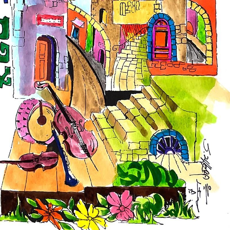 "City of Safat" is a one-of-a-kind hand watercolored mixed media on paper by Sami Zilkha, hand signed by the artist. Includes Letter of Authenticity. Measures approx. 9" x 12" (border), 7" x 10" (image).