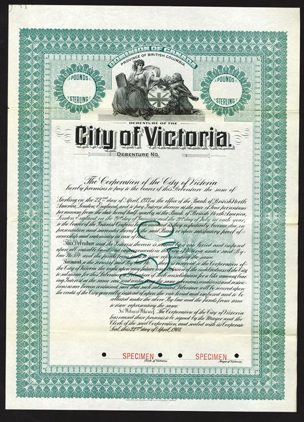 Victoria-British Columbia, Canada. £-Odd Amount Specimen 4% Debenture Bond, Black print on large green border and under tint, Allegorical figures at top next to Union Jack flag, Specimen overprints and POC's, Fine condition with splitting along fold lines, ABNC.