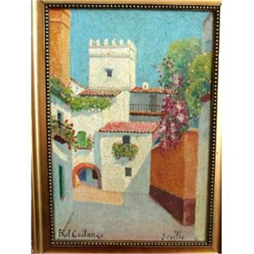 A lovely little oil painting of Seville, Spain, dated 1936. Oil on canvas. In good condition with some craqueleure, but no paint missing. Original frame. Seville, 1936 on verso. Gold frame in good condition with minor wear. A very cute painting, signed F. Gel Gallango lower left.