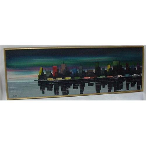Oil painting on canvas with gold frame, 17" X 49". Modern interpretation of a city view, New York like skyline reflected in water and a multi color sky. Likely painted in the 1960's.