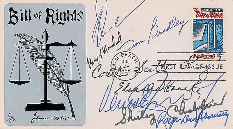 FDC with an affixed metallic cachet honoring the Bill of Rights and James Madison, signed in ink and felt tip by eight Civil Rights leaders, including Coretta Scott King, Ralph Abernathy, Shirley Chisholm, Thurgood Marshall, Edward Brooke, and three others. In fine condition.