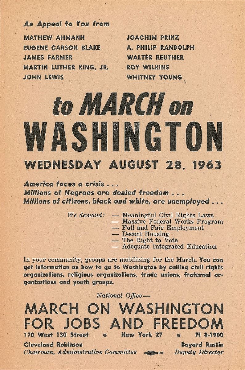 Rare flyer for the tremendously important March on Washington for Jobs and Freedom on August 28, 1963, issued by the National Office, one page, 5.5 x 8.25, outlining the goals of the upcoming march and movement as a whole. Among the organizers of the march listed at the top are the especially notable ‘Big Six’ of Martin Luther King, Jr., James Farmer, John Lewis, Roy Wilkins, A. Philip Randolph, and Whitney Young. In fine condition.
