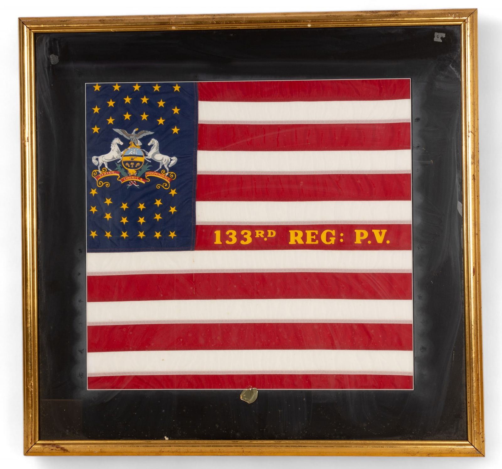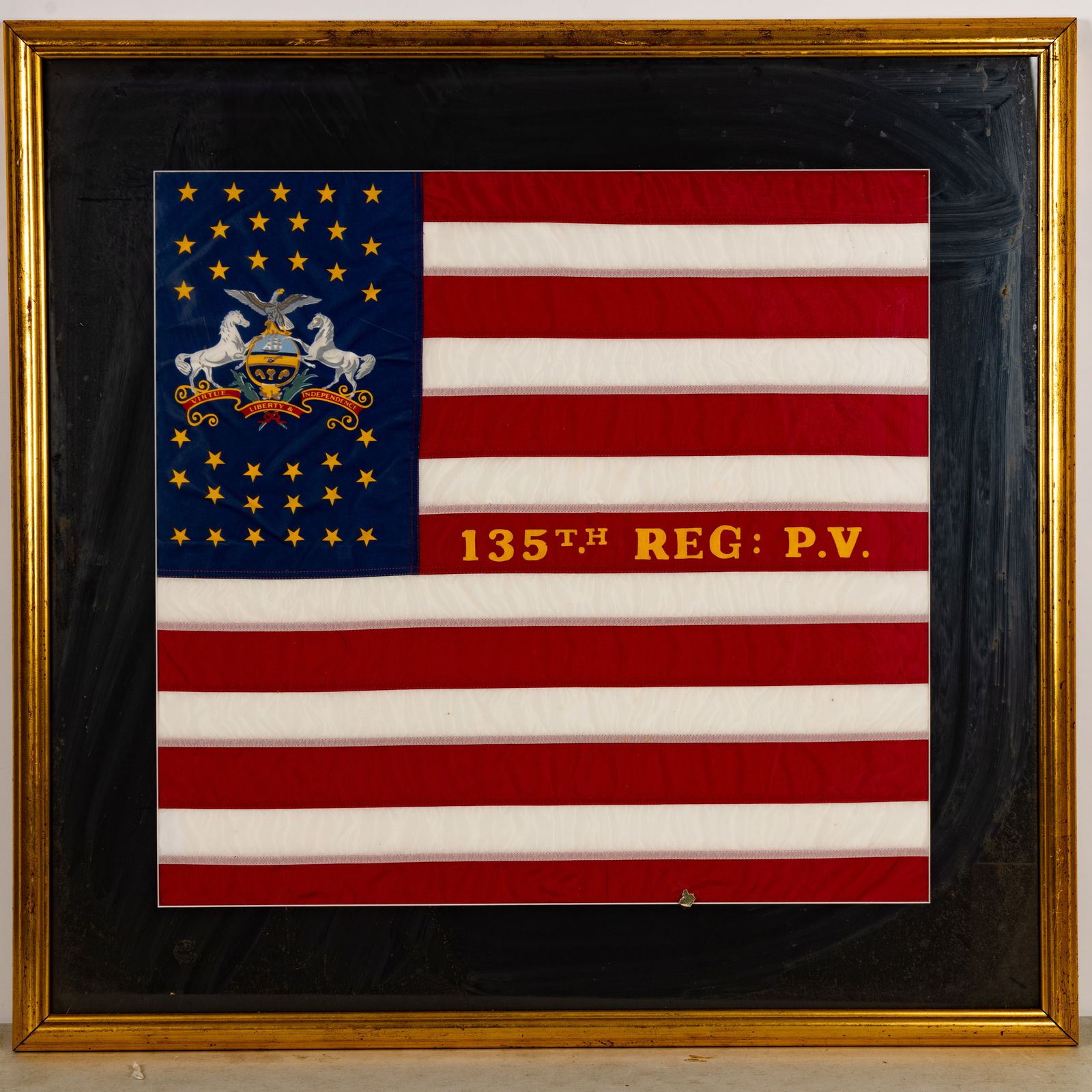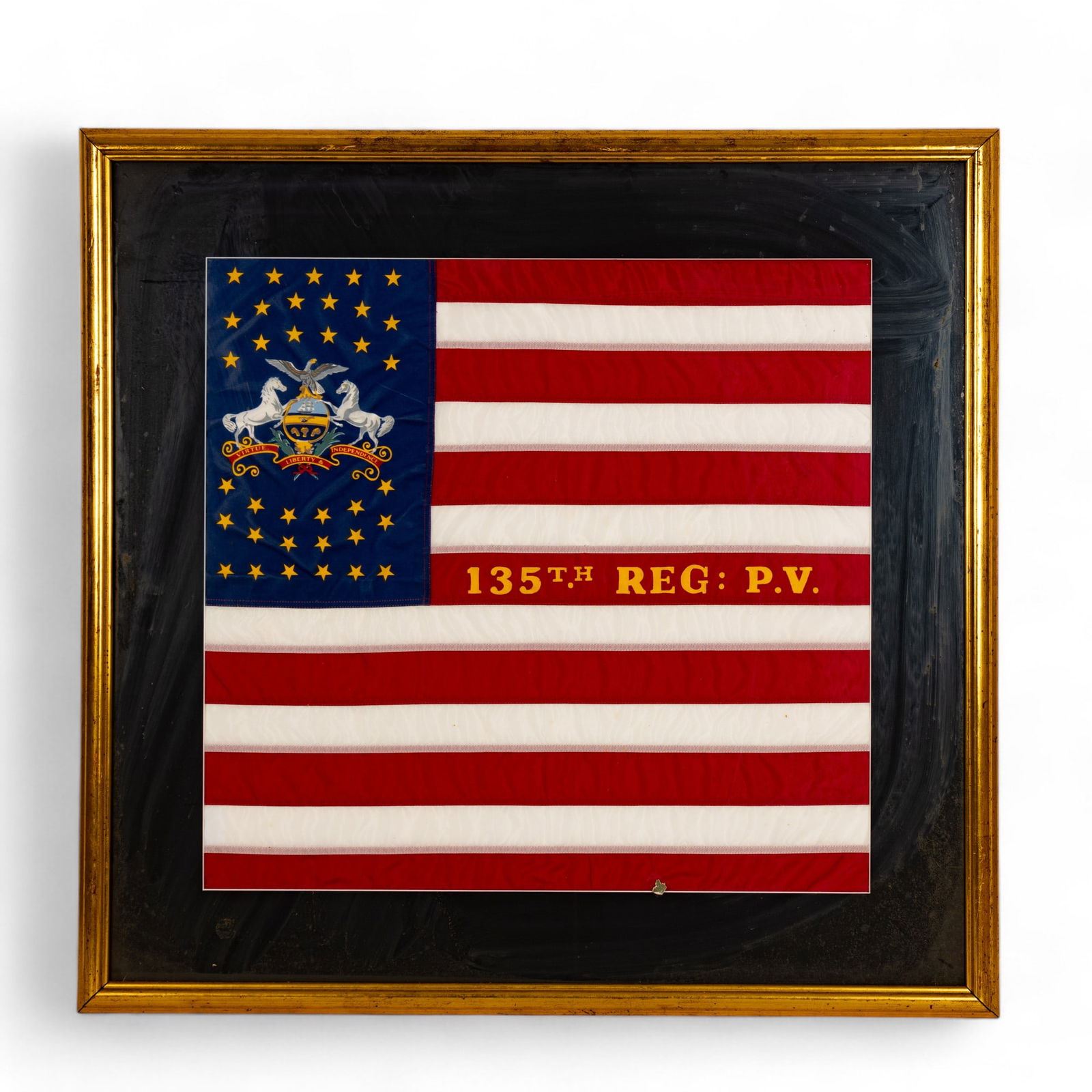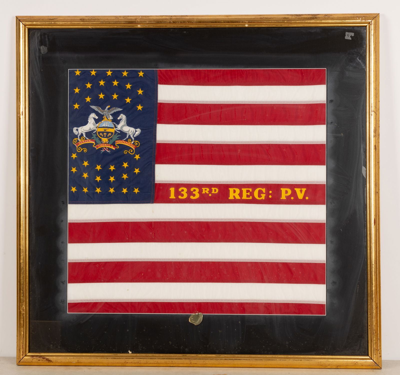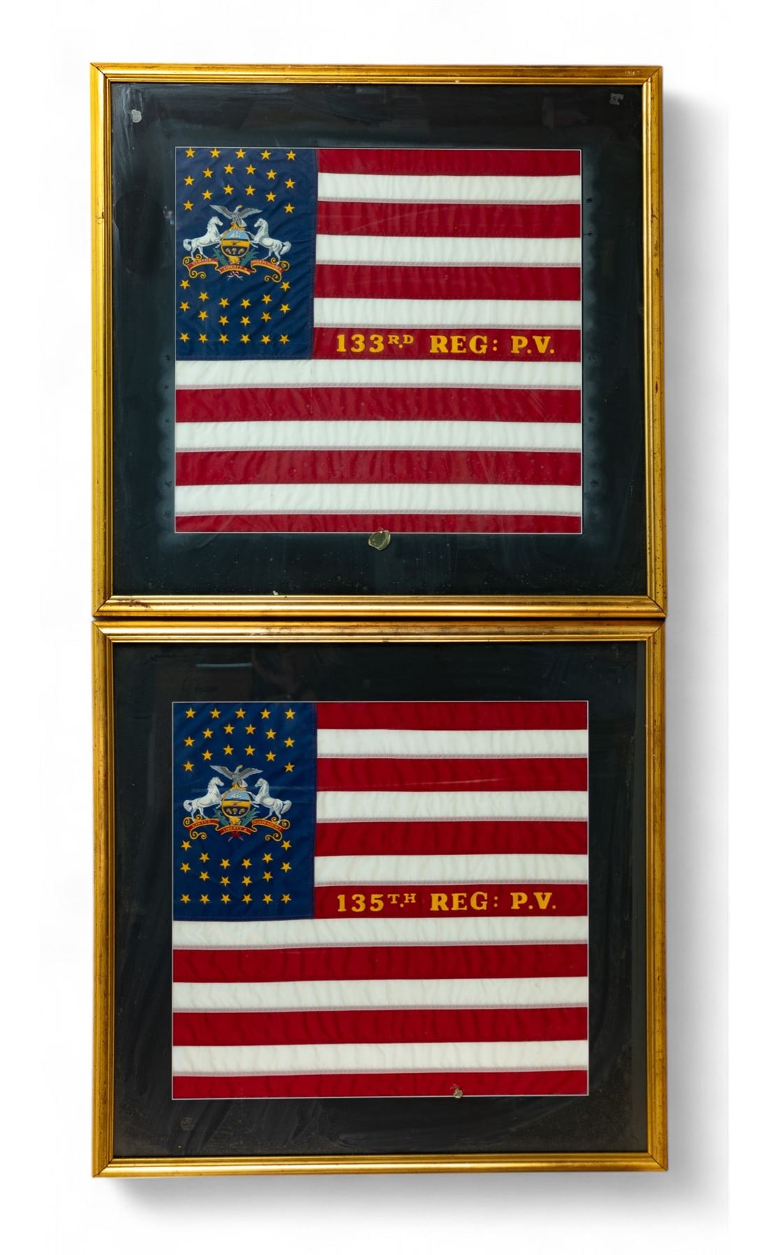 Framed commemorative / reenactment flags of the 133rd and 135th Regiment of the Pennsylvania Volunteer Infantry for the Union Army during the American Civil War. Each frame measures approx. 34.5" x 33.5".