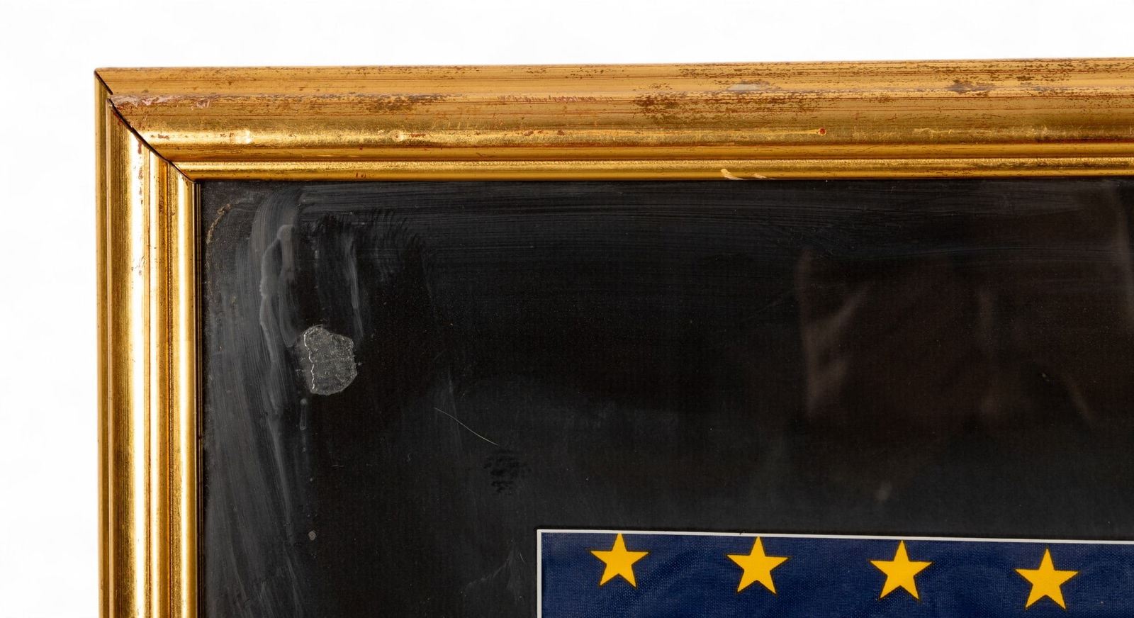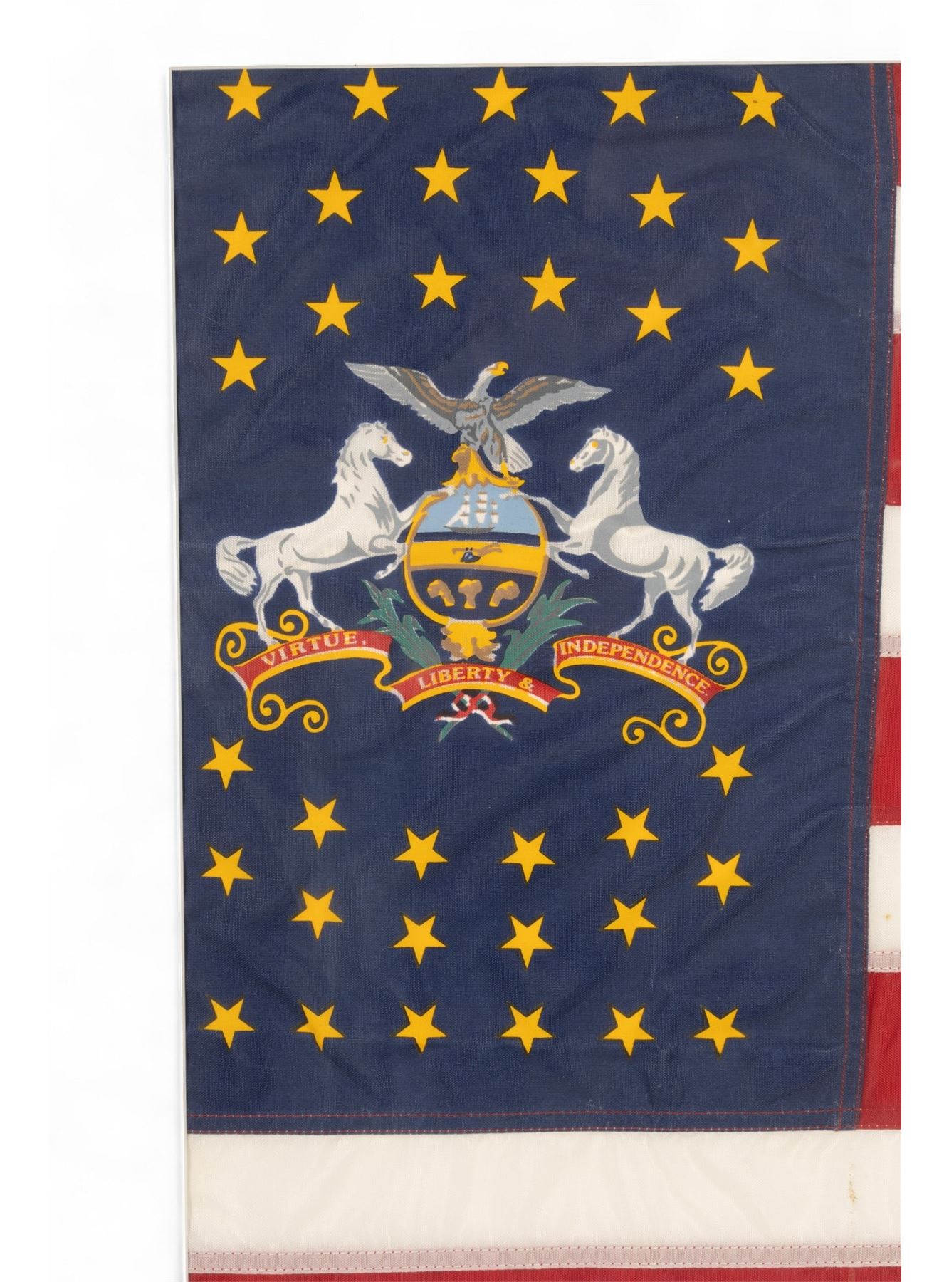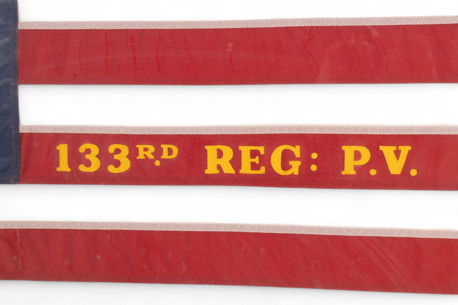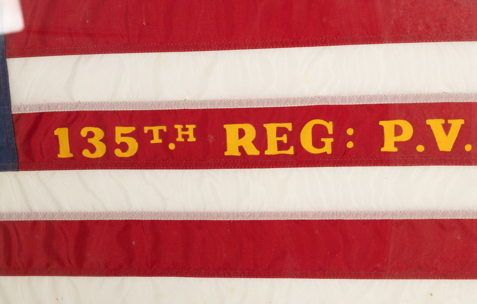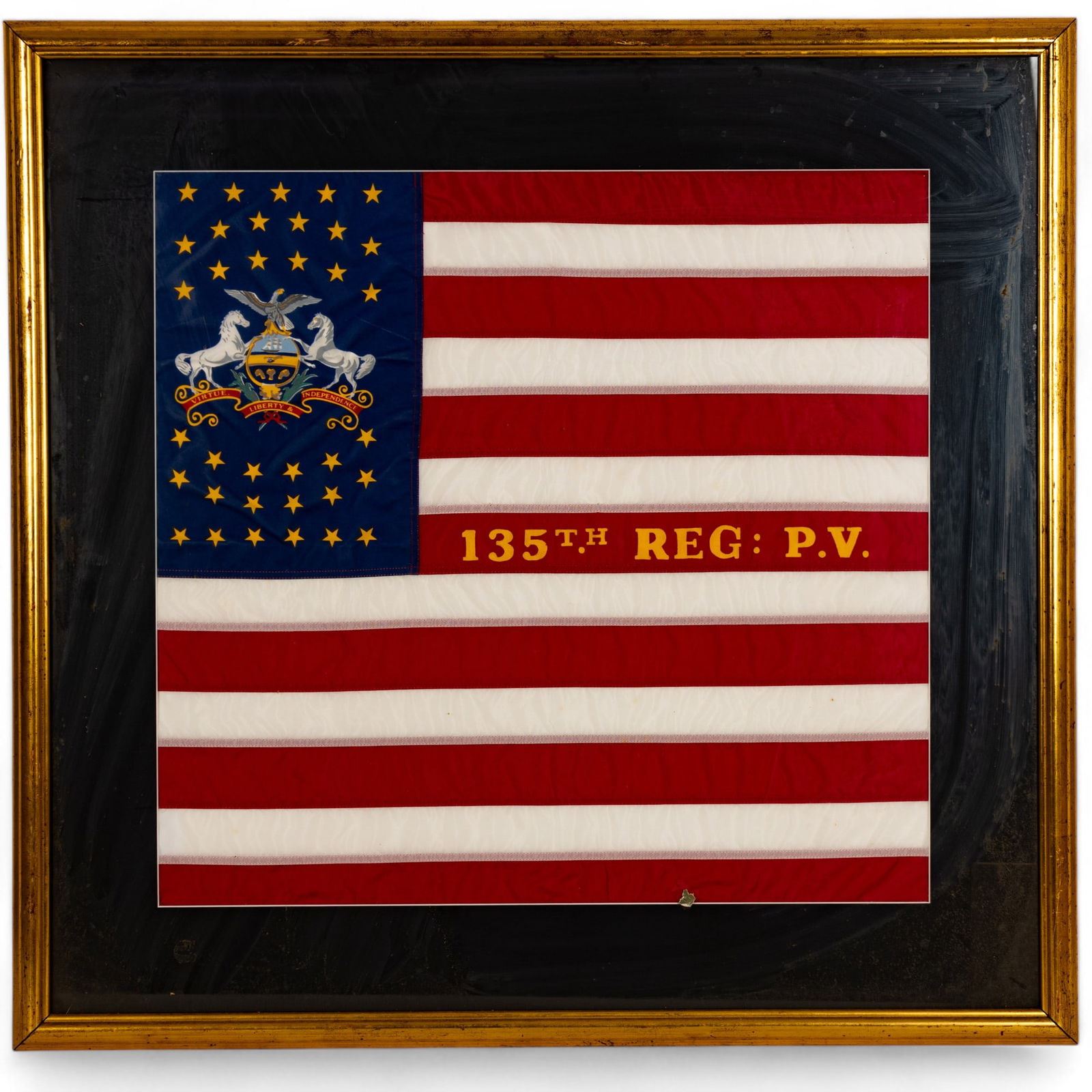 Framed commemorative / reenactment flags of the 133rd and 135th Regiment of the Pennsylvania Volunteer Infantry for the Union Army during the American Civil War. Each frame measures approx. 34.5" x 33.5".