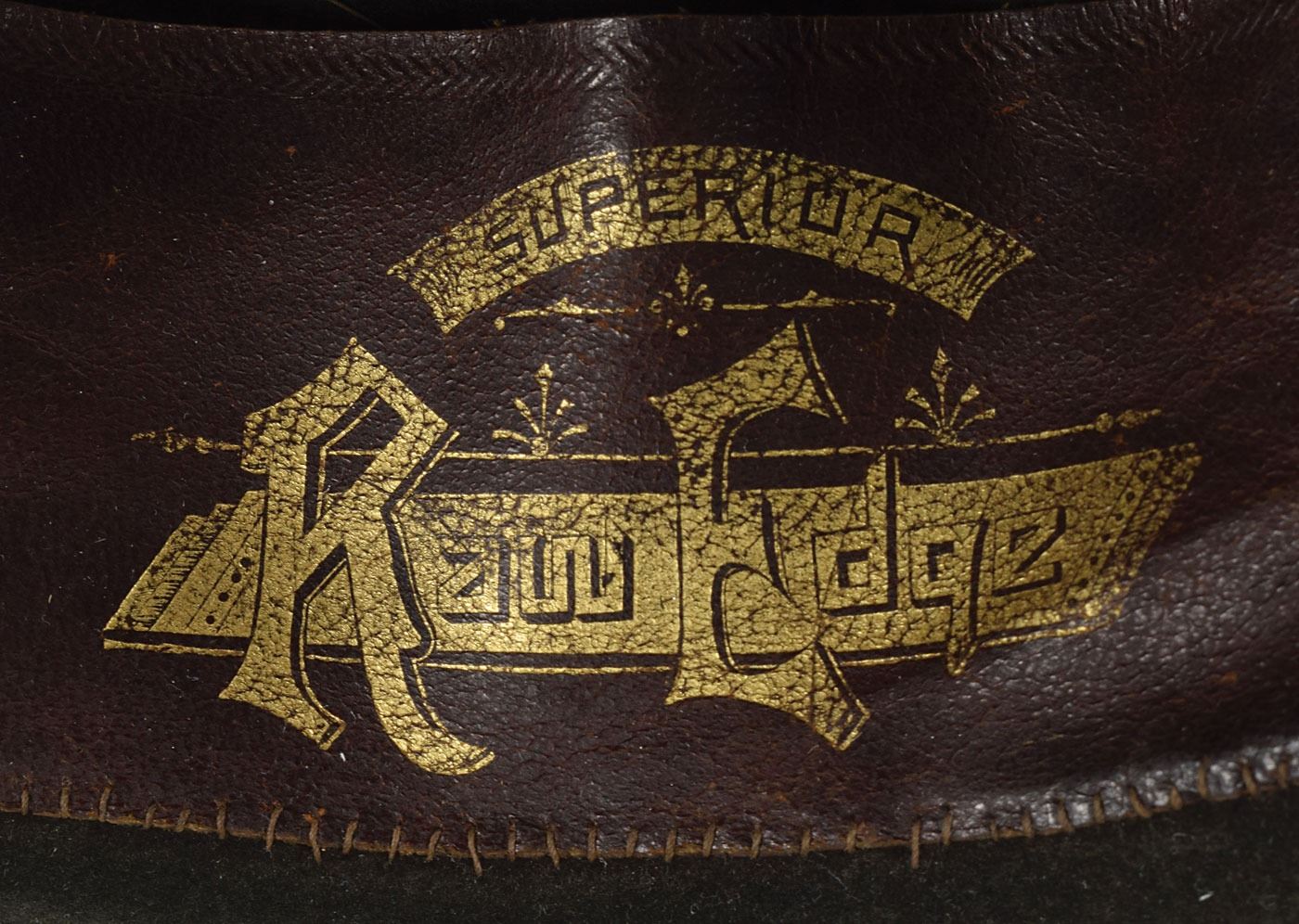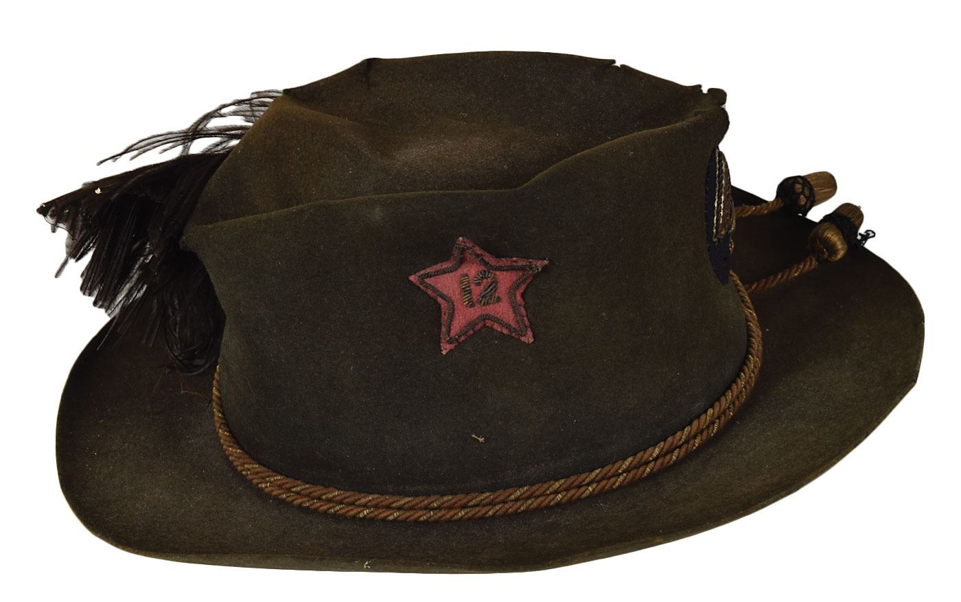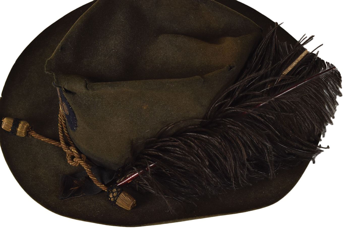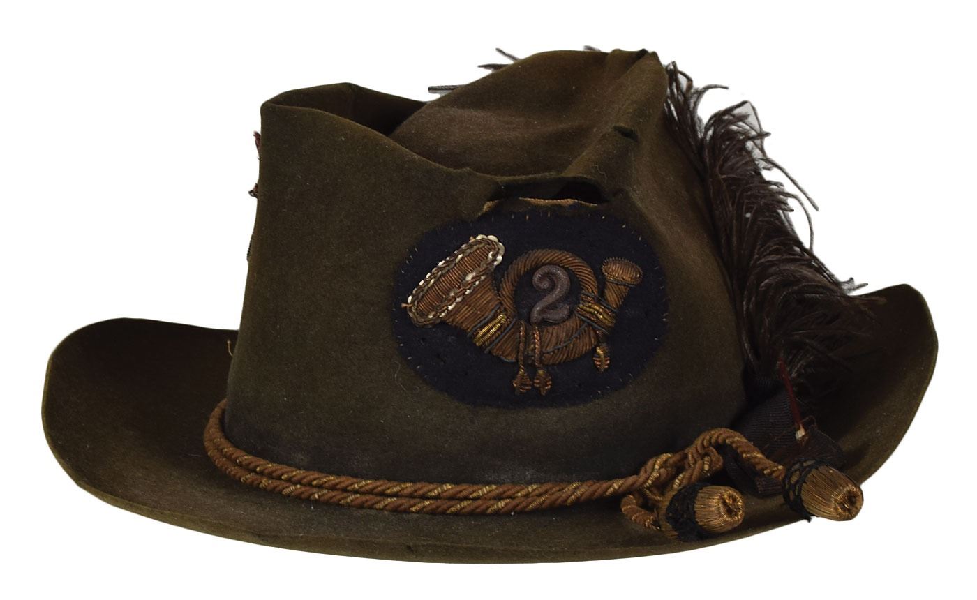Dark wool felt hat with 2 3/8? brim that has a large, embroidered bullion infantry horn emblem sewn to the front of the crown with embossed metal regimental number: “2.” The right side of the crown has a small felt five-pointed star emblem with embroidered wire border, and “12” in the center (the emblem was once red, but has since faded to pink). The crown has a fairly crushed appearance with large depression at the top, and several tears through the felt at the folds and creases along the edge. The thin leather comfort band inside is intact, and has a still legible “Superior / Raw Edge” label printed on the left side, and a small size surcharge that is difficult to read. The bullion hat cord has turned to a dull ochre-brown over time and a large black ostrich plume is sewn to the left side of the crown, along with a fragment of the original black silk hat band. The hat is similar to the GAR slouch hat, but is slightly thinner and with different proportions. It was probably converted from a dress hat sometime in the 1870s or 1880s. The star was the emblem of the XII Corps, with red denoting the 1st Division. The only regiment in the 1st Division that matches the regimental number on the hat was the 2nd Massachusetts Infantry, and we can be fairly certain that the owner of this hat proudly served in that unit. This is a great piece of Civil War veteran’s memorabilia, and would make a great addition to any collection.