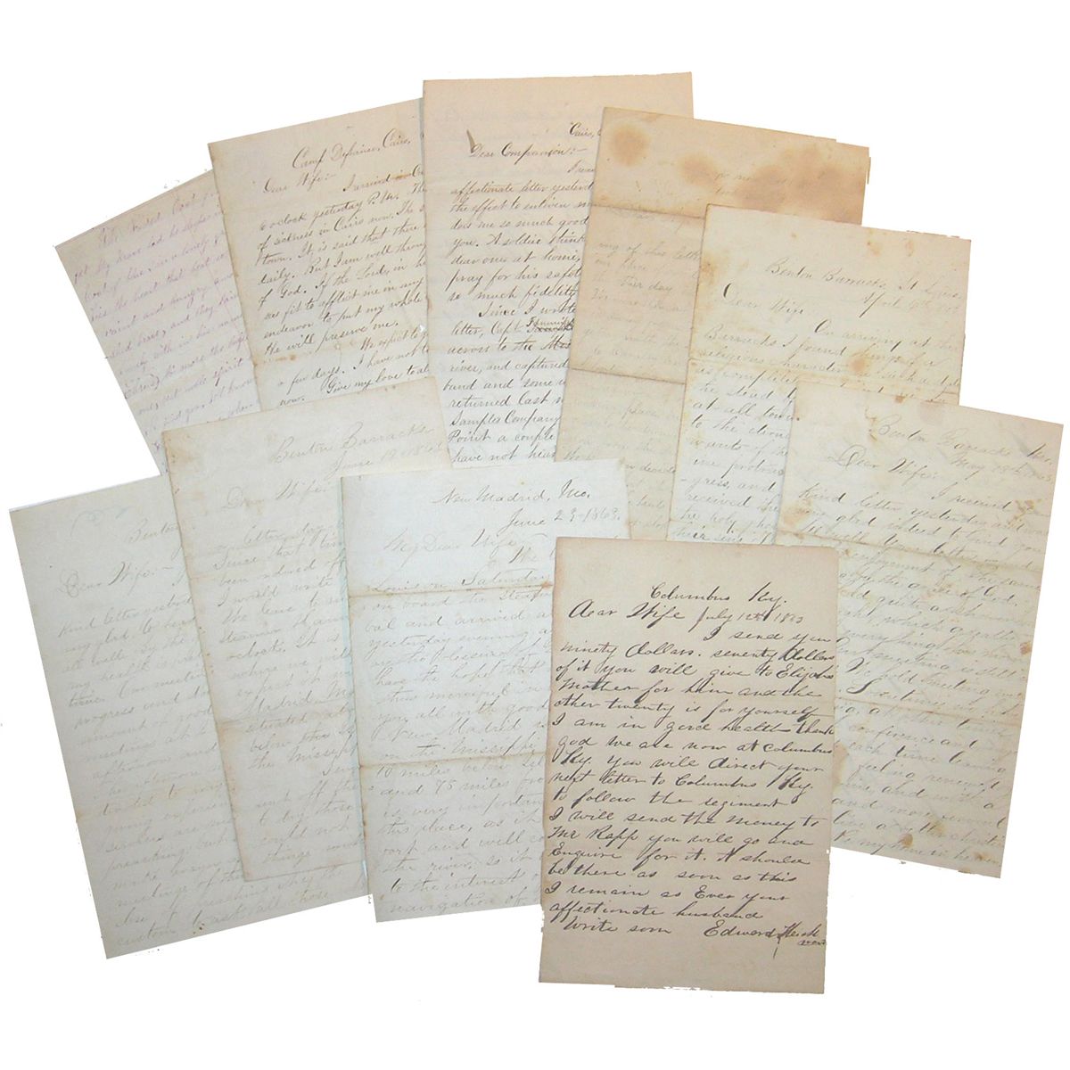 Fantastic collection of eight Civil War letters by Wilson J. Barnett of the 53rd Pennsylvania Volunteer Infantry. Letters to his parents dated from 11 October 1861 to 15 September 1864 recount many battles fought by the regiment, including Antietam and Cold Harbor. First letter from Camp California, dated 10 December 1861 reads in part: ''…there are many in the north who think that the war will soon be ended…we know there is a large army in front of us very strongly entrenched and ready to accept battle…As soon as Manassas is ours we may look for peace.…'' The 53rd would be involved in the general advance toward Manassas in March 1862. Letter dated 14 January 1862 from Camp California tells of the U.S.S. Pensacola running the ''rebel blockade'' on Saturday morning and of hearing ''…the booming of the rebel cannon firing at her on Saturday night…'' In the same letter: ''…It is likely that we will be moved towards Springfield or Fairfax Ch - but will be held as a reserve. I don't think there is any idea of making a direct attack on Manassas…'' In late summer, after several battles in Virginia, the 53rd moved into Maryland with the Army of the Potomac where they clashed with Confederate troops at Antietam on 17 September. Letter dated 21 September 1862 from the Antietam battlefield reads in part: ''…Oh! The horrors of this battlefield…Battle lines can be distinctly traced by the heaps of dead…Our regiment was detached to hold a certain position…as our line was giving way…The rest of our Brig went in and regained all we had lost…That finished the fighting at close quarters…'' Barnett watched an officer die in front of him: ''He was the bravest most gallant officer in the Regiment.'' After Antietam, the 53rd moved into Virginia again with the Army of the Potomac. On 10 November 1862 Barnett is an eyewitness to the end of General George McClellan's command of the Army of the Potomac: ''…Today witnessed the parting of General McClellan and his army…As he rode past…his countenance wore a sad aspect and many a brave soldier felt the warm tears trickling his bronze cheeks…'' Letter dated 30 May 1864 from Wilson's Landing, Virginia: ''…the colored troops fulfilled our highest expectations, this was the first time they had been under fire…'' Letter dated 22 September 1864 from City Point, Virginia: ''…We are feeling very jubilant after Sheridan's great victory in the [Shenandoah] Valley. A few more such blows and all will be over…'' Letters, ranging from 5'' x 8'' to 7.75'' x 9.75'', on lined paper show expected folds and minor foxing and soiling. Overall very good condition.