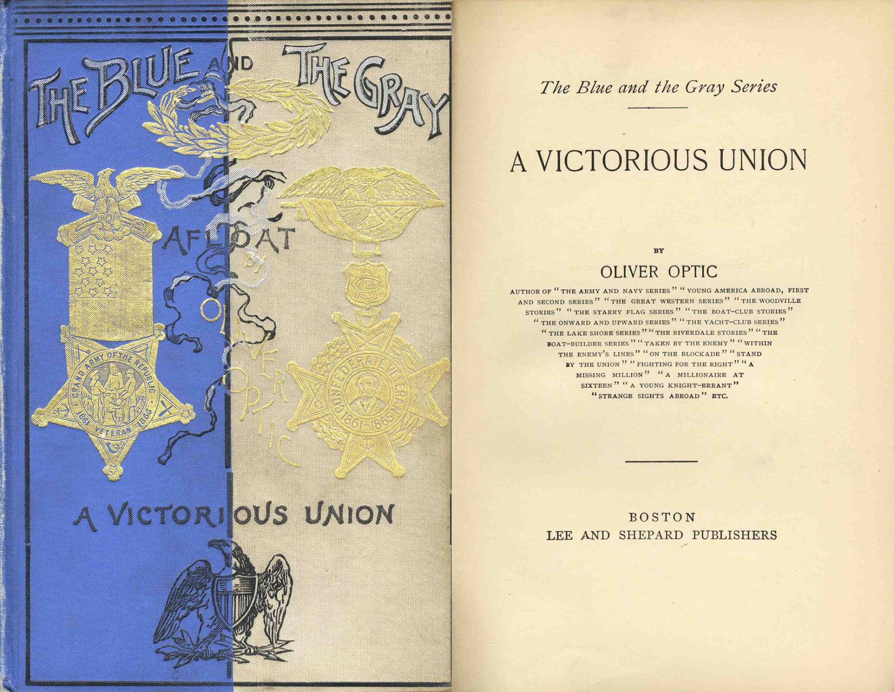 ''A Victorious Union'' by Oliver Optic. Boston: Lee & Shepard: 1893. First edition octavo hardcover runs 361pp. and includes several illustrations. The sixth and final book in ''The Blue and the Gray Series'' of historical fiction for young adult readers set during the Civil War. Chapters include: ''A Happy Return to the Bellevite'', ''A Lively Chase to the South-West'' and ''A Very Melancholy Confederate''. Minor rubbing and soiling to decorative blue and gray cloth boards. A handsome volume in near fine condition.
