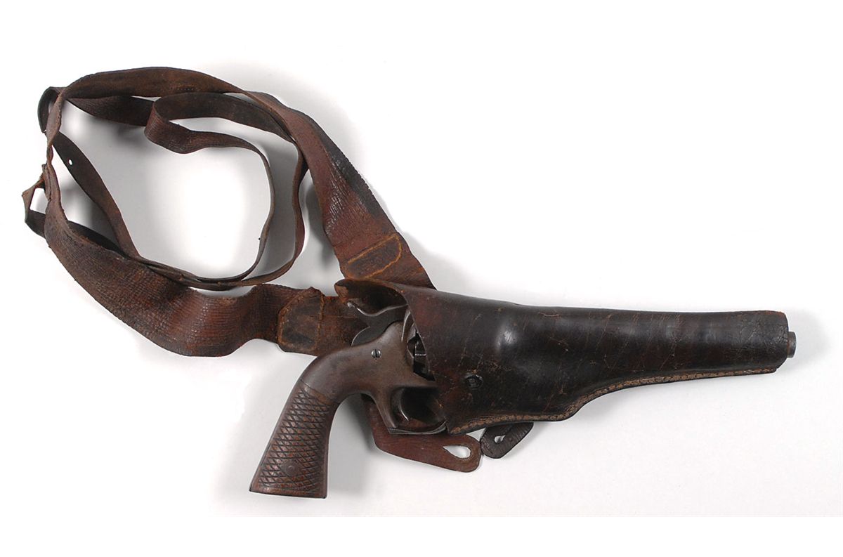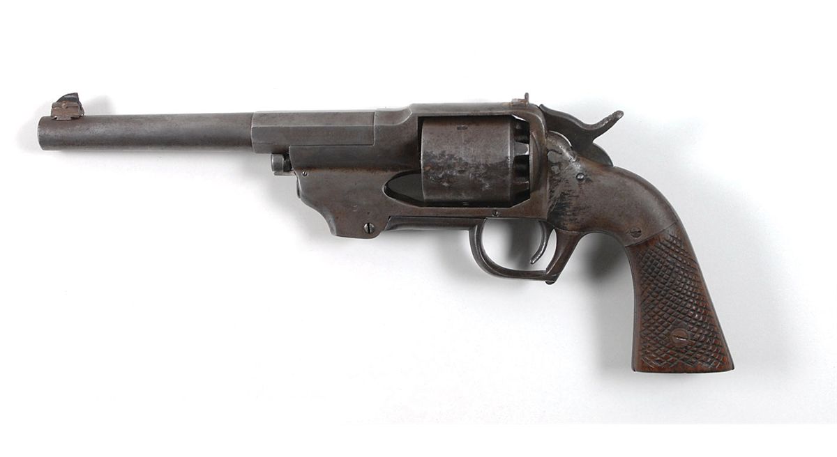 Scarce Civil War Allen & Wheelock Percussion Army revolver, ser. #101, .44 caliber, 7 3/8? round barrel with octagonal breech, very good bore. The cylinder has a matching number. The sights are replacements with a target style blade dovetailed into the muzzle and a shallow leaf rear soldered on the top strap. The hammer spur and end of the cylinder pin have been altered; the top of the sideplate has a small welded repair; and the walnut grips have been nicely checkered. Most of the metal has a smooth gray patina with small patches of pitting on the right side of the barrel, the very edge of the right side of the top strap, and over one chamber. The grips are in very good condition; factory lettering is in fine condition; and the mechanism works well. This is accompanied by a good condition 19th century brown leather holster that has been altered to a shoulder holster. This gun is sufficiently scarce enough to warrant the attentions of a good gunsmith to restore the sights and hammer spur to original configuration.