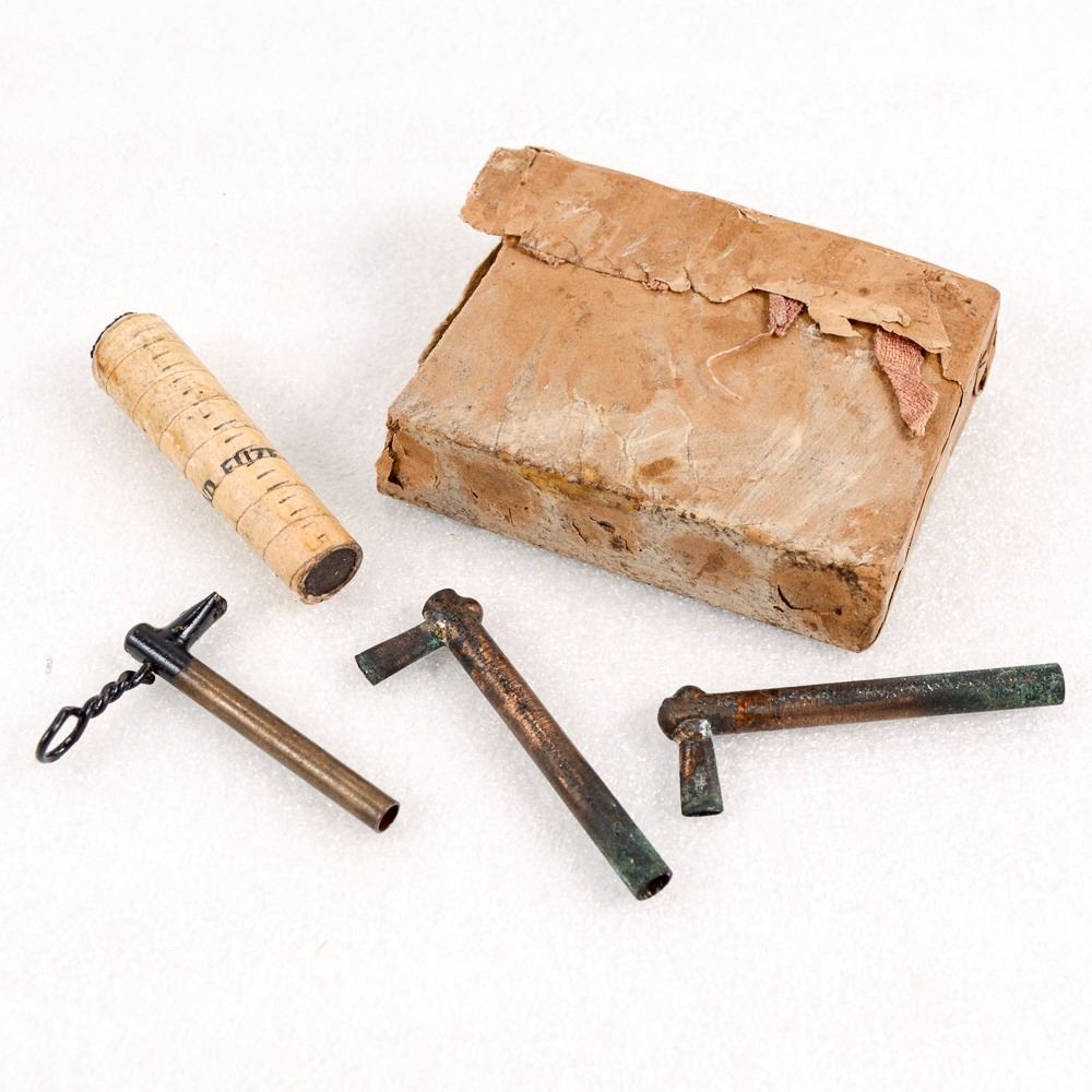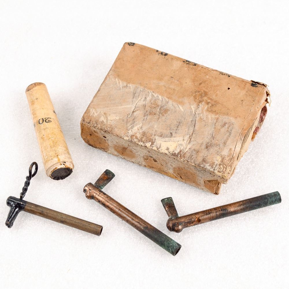 Includes 3 friction primers, 2 have been used, and a box of 5 20 second artillery timed fuzes.
