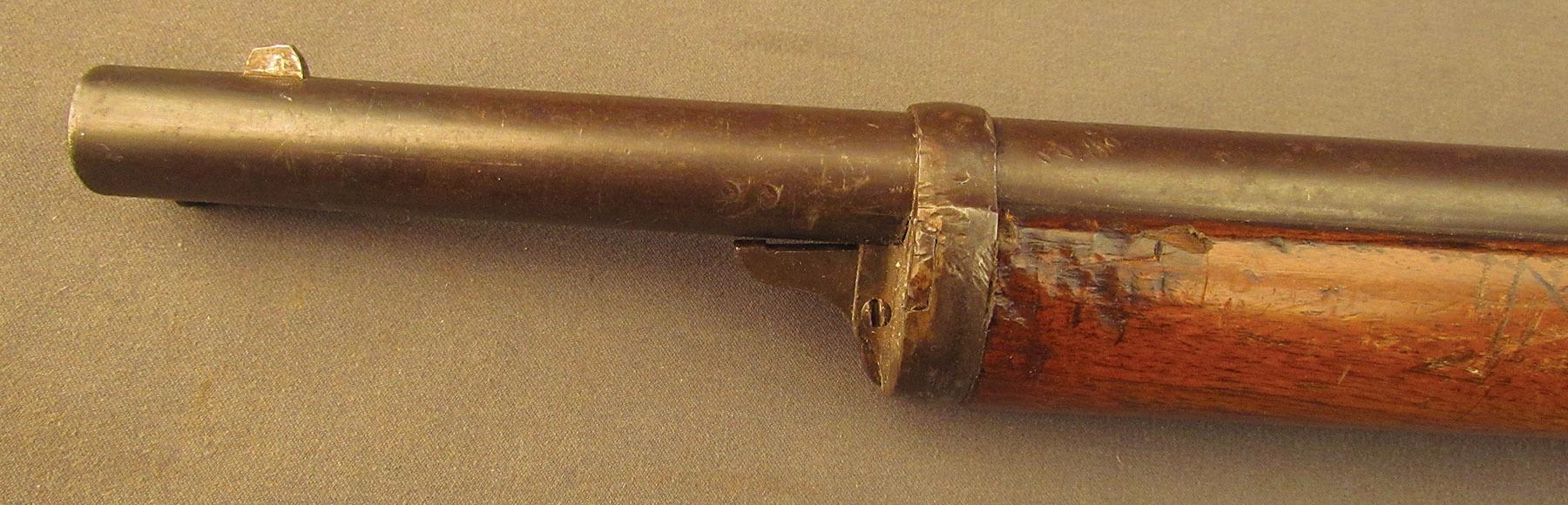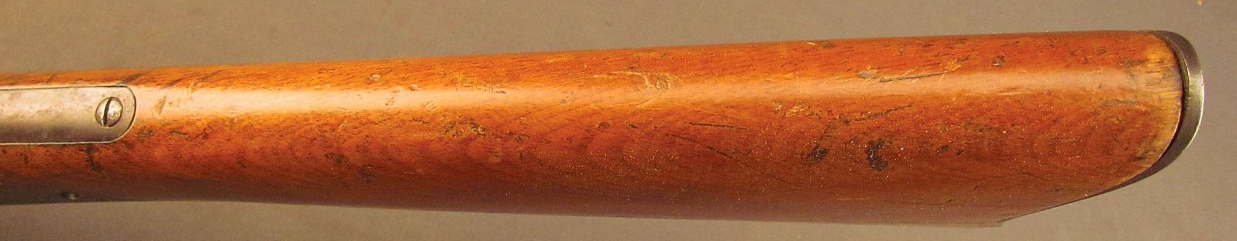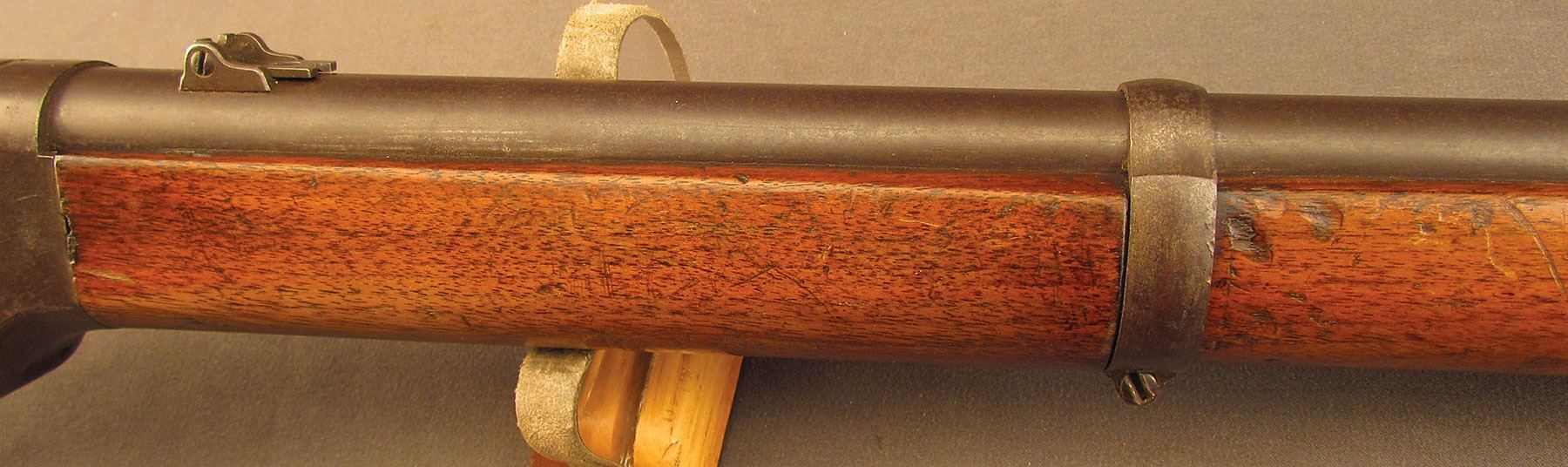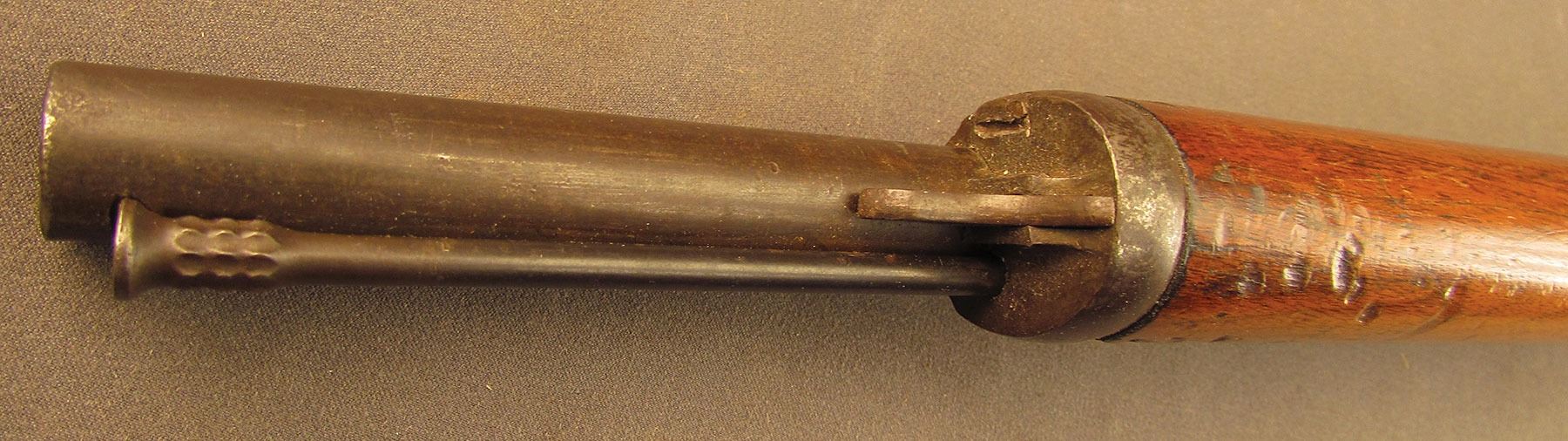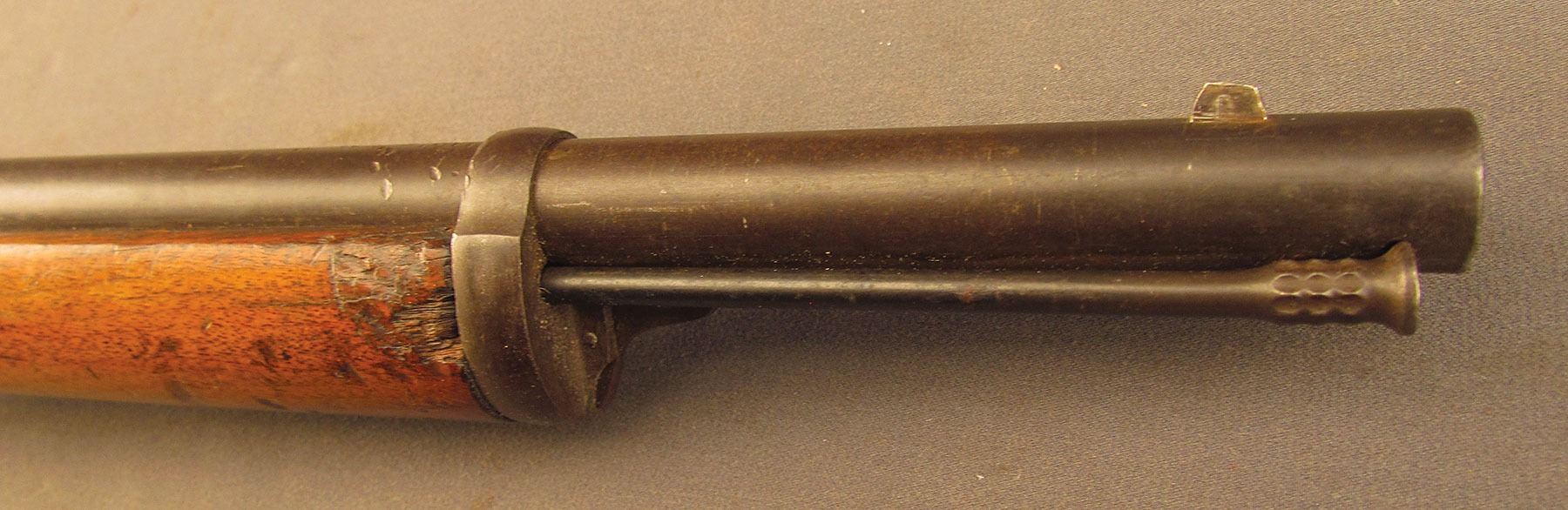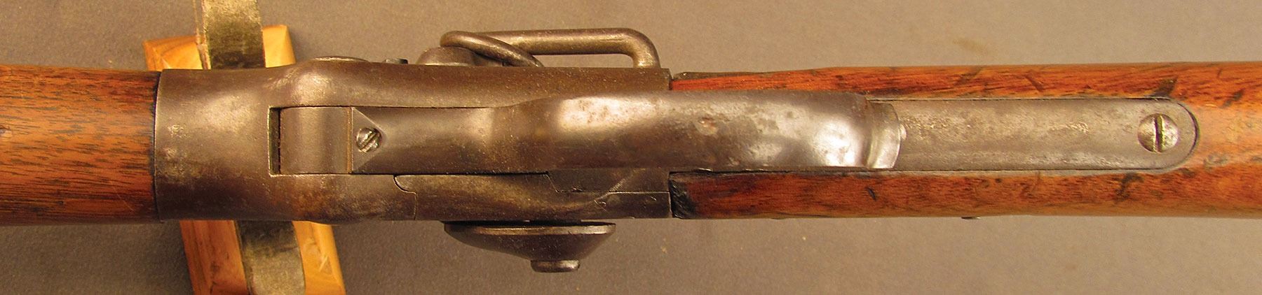 Civil War Ball Cavalry Carbine, one of 1,002 produced, no serial number, .50 RF, 20 1/2? barrel with a very good bore that has some light freckling and pitting within the grooves. This is a seldom seen carbine that has an overall dark plum-brown patina with some traces of mild gray on the hammer and right side of the frame and bolt. Additionally, there is a series of peen marks along the top of the receiver and lower edge of the sideplate just behind the hammer. The magazine cut-off on the left side and the triggerguard/lever pin retain about 90% of an added blue finish with mild gray fading on the balance. The "US" and Lamson & Co markings on the left side are still quite clear. The walnut forend and buttstock have an added varnish finish over numerous small handling marks and surface blemishes throughout with a further sizable chip missing from the left side of the wrist. The carbine comes with an original ramrod and the action is fully functional. These carbines were ordered in 1864 but weren't delivered until May of 1865 after hostilities had ceased (1,002 produced). Nevertheless, they are considered a secondary Civil War weapon and are seldom seen today. This example is in very good condition and would make a great addition to any collection.