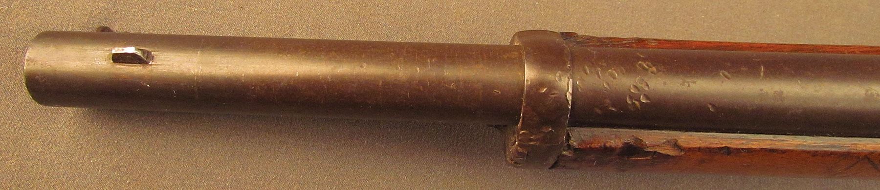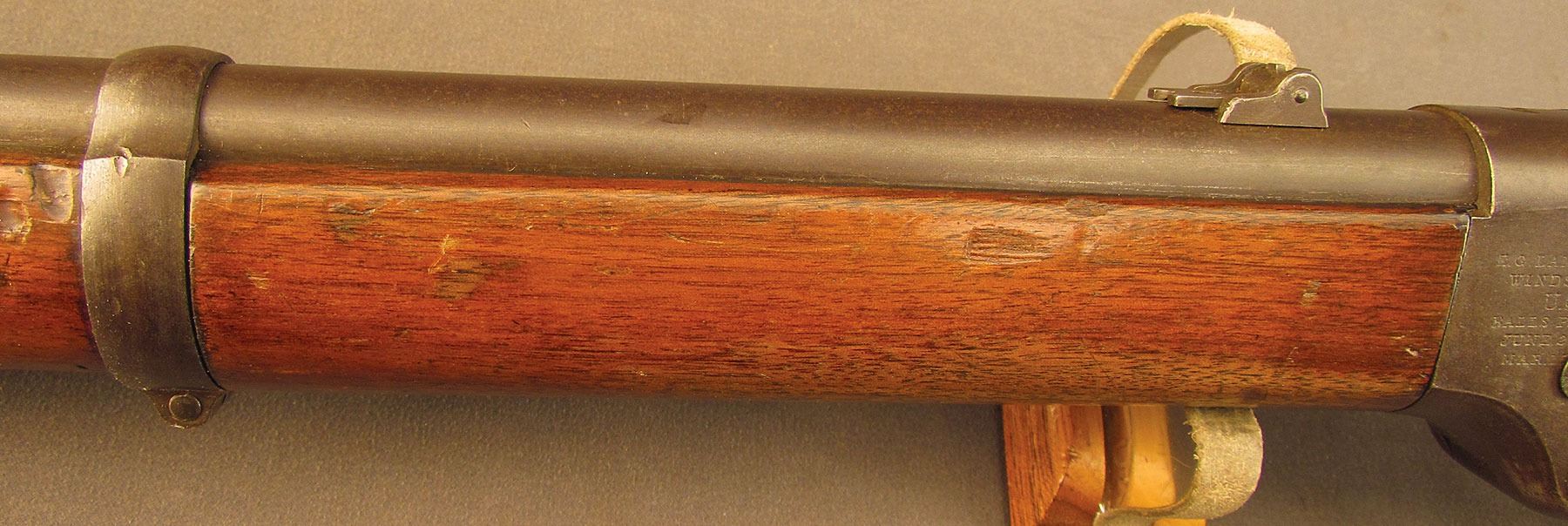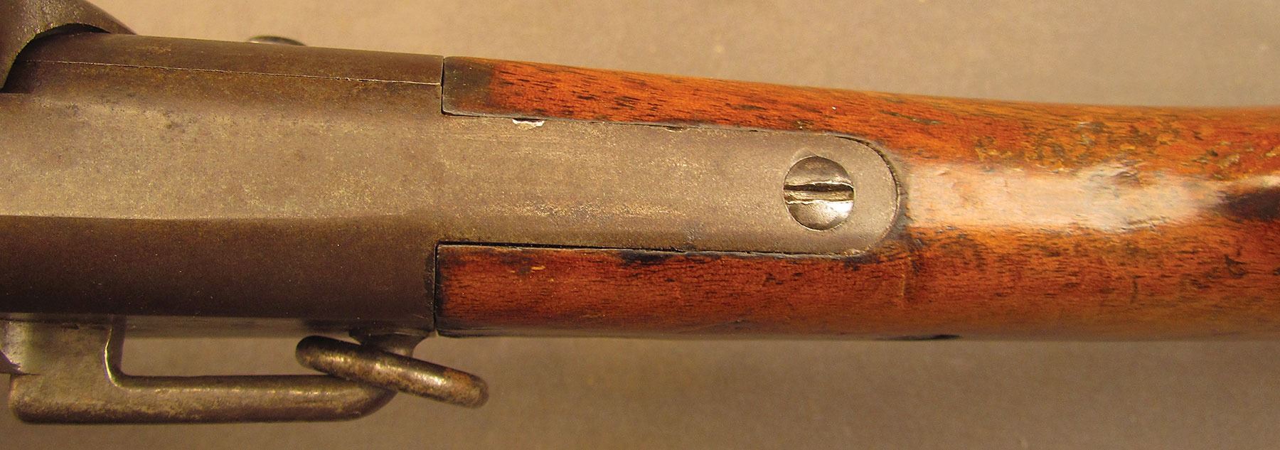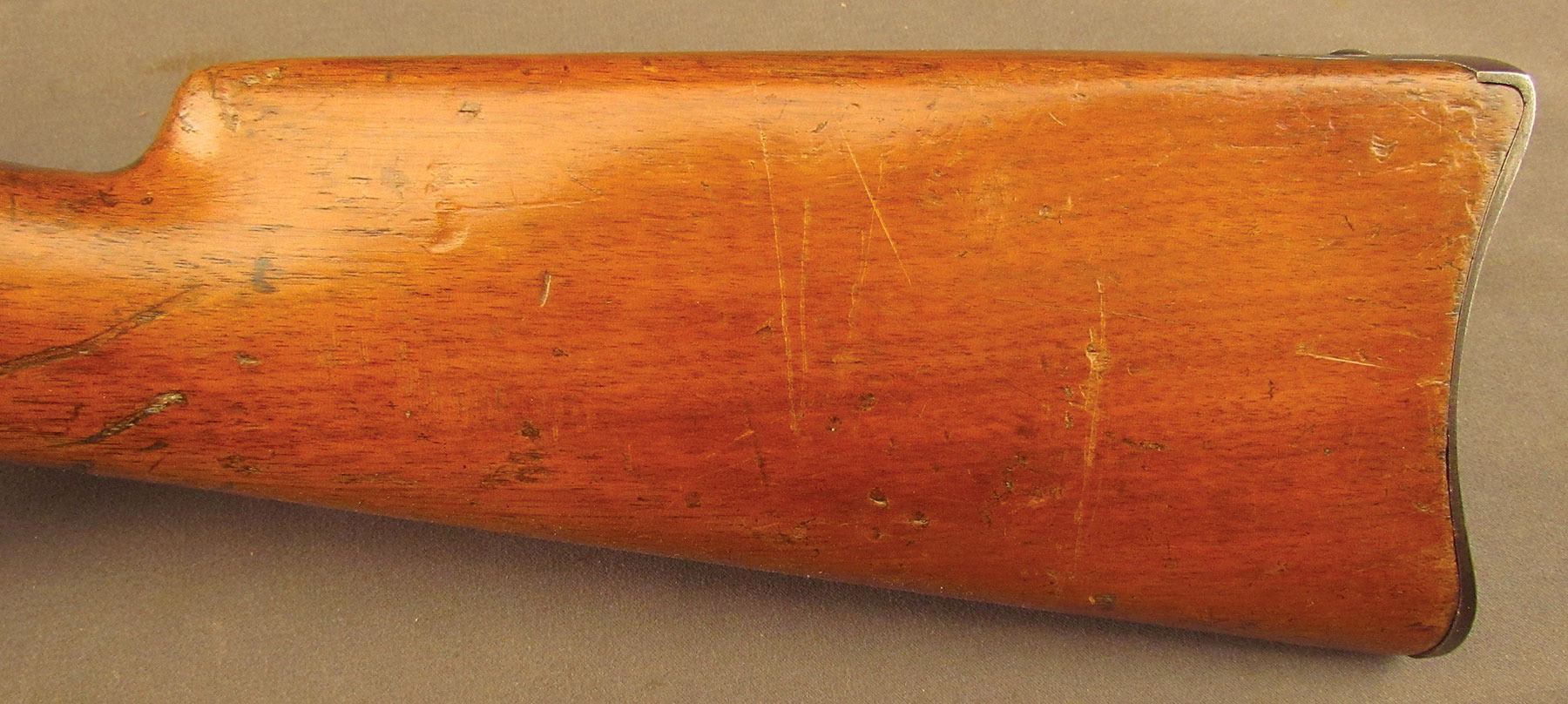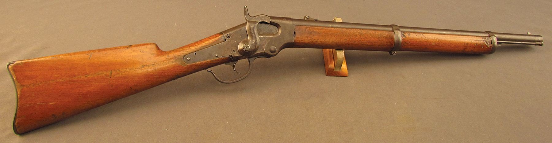 Civil War Ball Cavalry Carbine, one of 1,002 produced, no serial number, .50 RF, 20 1/2? barrel with a very good bore that has some light freckling and pitting within the grooves. This is a seldom seen carbine that has an overall dark plum-brown patina with some traces of mild gray on the hammer and right side of the frame and bolt. Additionally, there is a series of peen marks along the top of the receiver and lower edge of the sideplate just behind the hammer. The magazine cut-off on the left side and the triggerguard/lever pin retain about 90% of an added blue finish with mild gray fading on the balance. The "US" and Lamson & Co markings on the left side are still quite clear. The walnut forend and buttstock have an added varnish finish over numerous small handling marks and surface blemishes throughout with a further sizable chip missing from the left side of the wrist. The carbine comes with an original ramrod and the action is fully functional. These carbines were ordered in 1864 but weren't delivered until May of 1865 after hostilities had ceased (1,002 produced). Nevertheless, they are considered a secondary Civil War weapon and are seldom seen today. This example is in very good condition and would make a great addition to any collection.