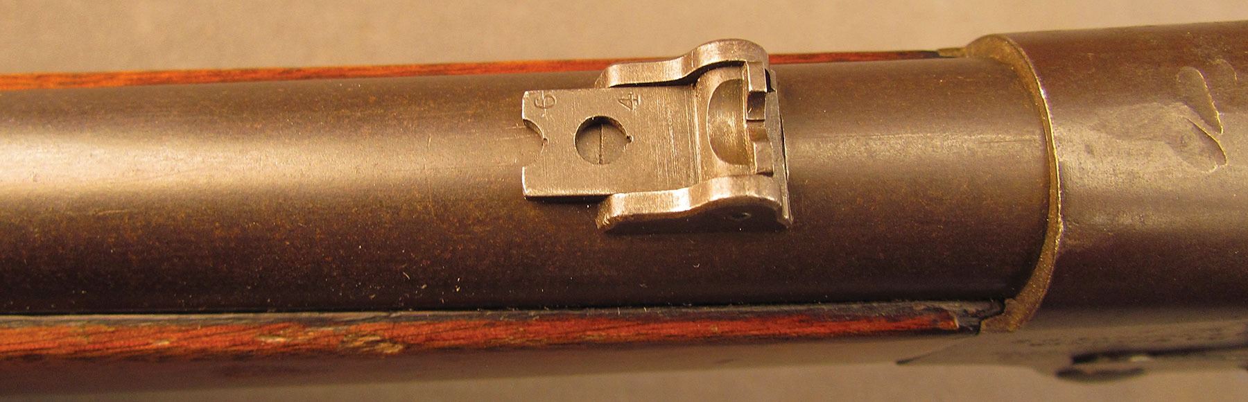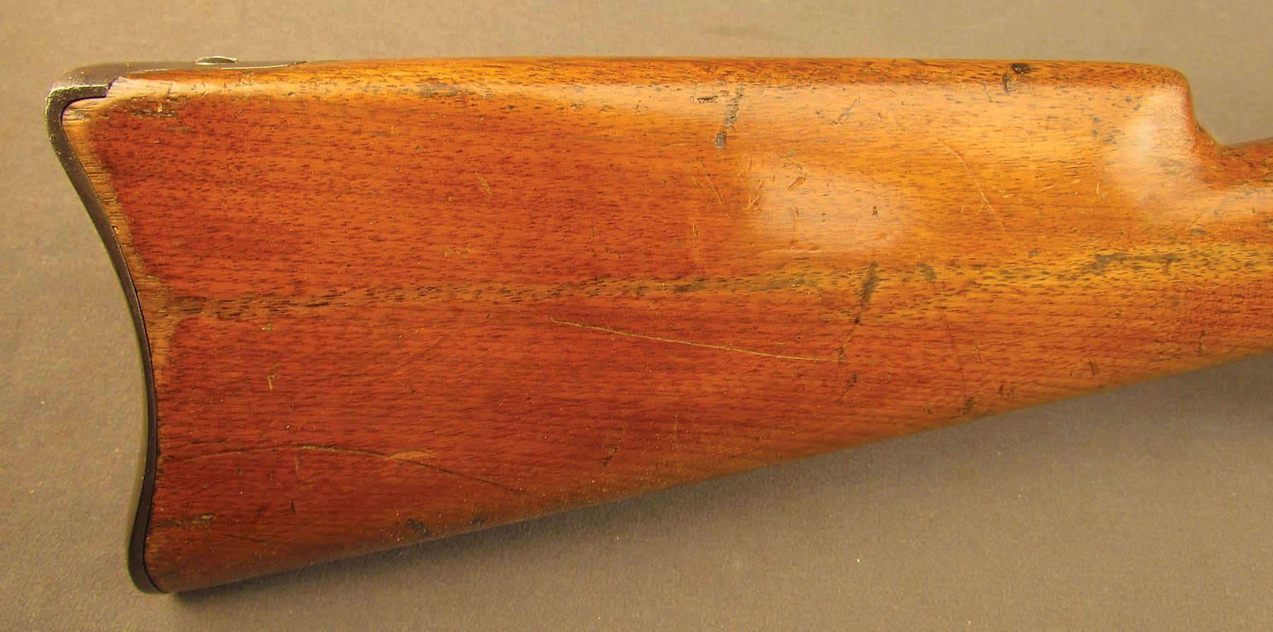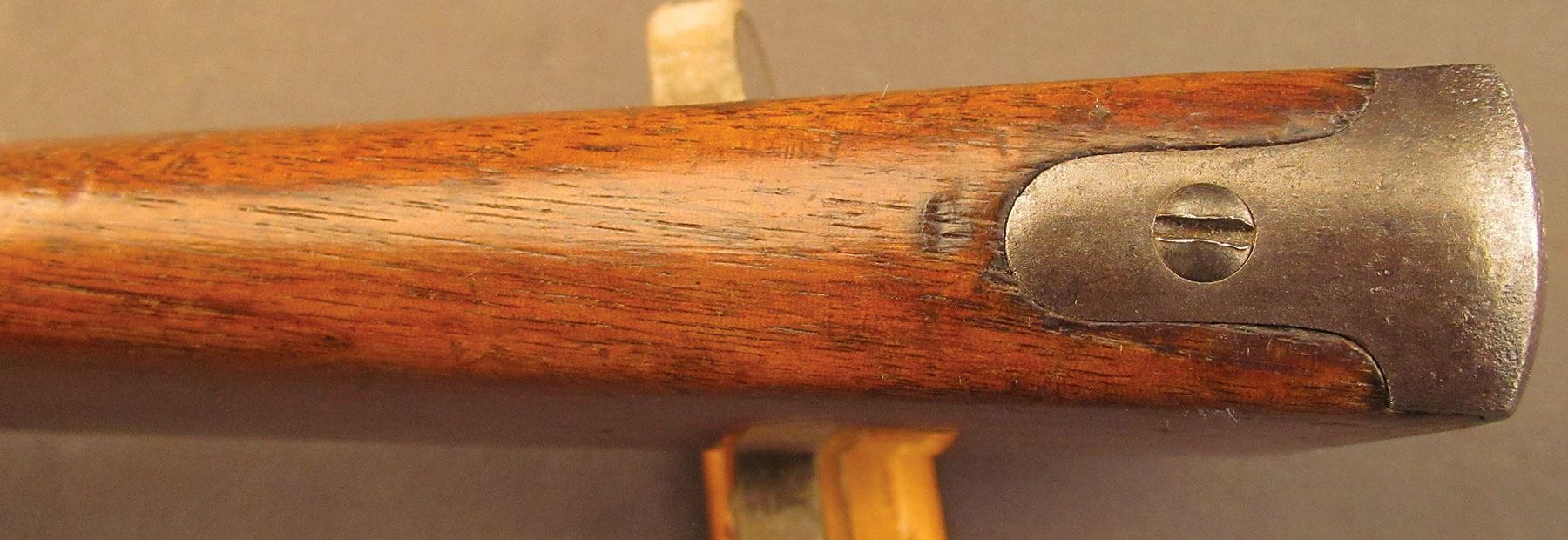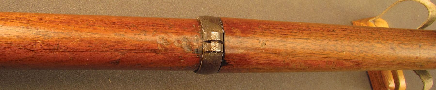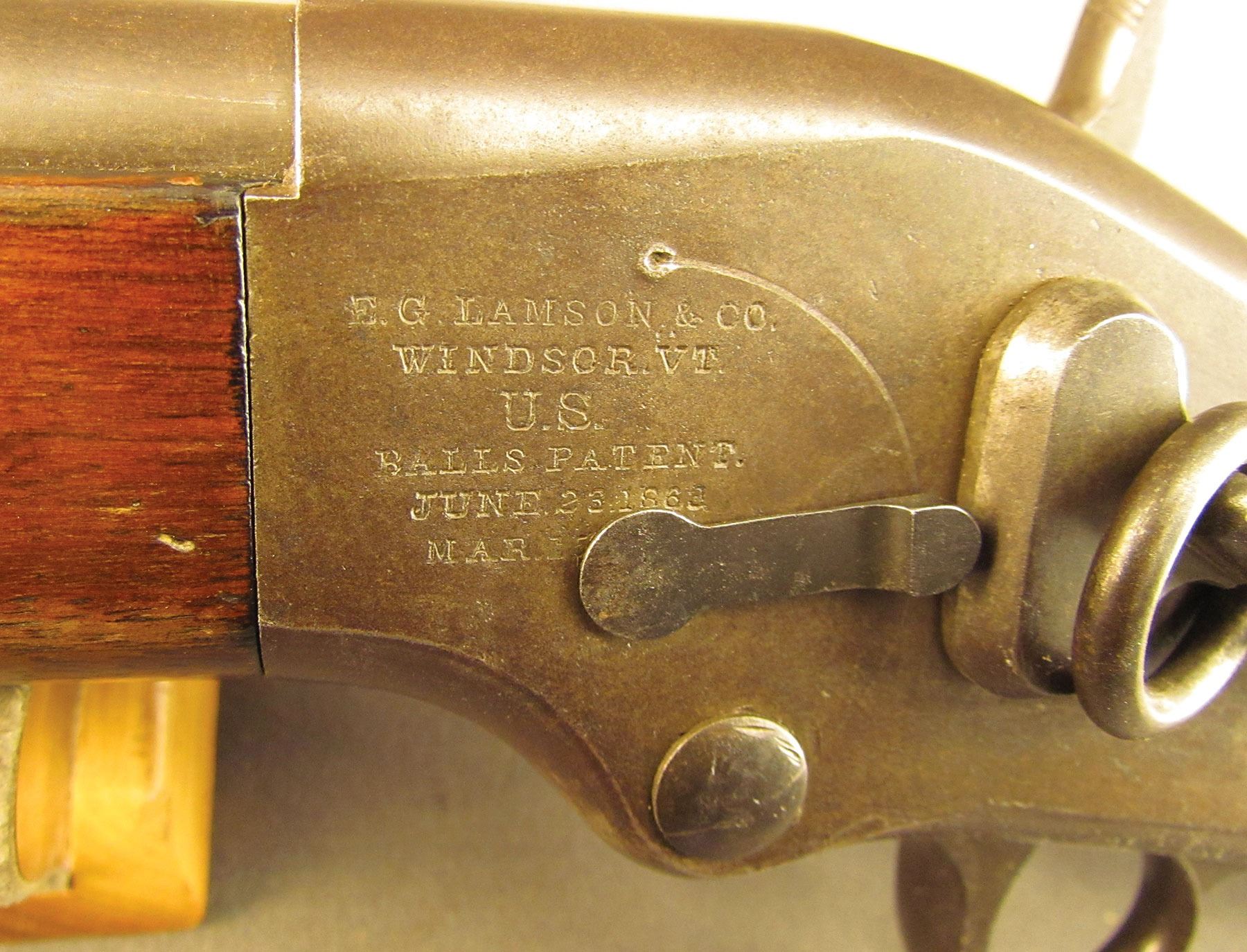 Civil War Ball Cavalry Carbine, one of 1,002 produced, no serial number, .50 RF, 20 1/2? barrel with a very good bore that has some light freckling and pitting within the grooves. This is a seldom seen carbine that has an overall dark plum-brown patina with some traces of mild gray on the hammer and right side of the frame and bolt. Additionally, there is a series of peen marks along the top of the receiver and lower edge of the sideplate just behind the hammer. The magazine cut-off on the left side and the triggerguard/lever pin retain about 90% of an added blue finish with mild gray fading on the balance. The "US" and Lamson & Co markings on the left side are still quite clear. The walnut forend and buttstock have an added varnish finish over numerous small handling marks and surface blemishes throughout with a further sizable chip missing from the left side of the wrist. The carbine comes with an original ramrod and the action is fully functional. These carbines were ordered in 1864 but weren't delivered until May of 1865 after hostilities had ceased (1,002 produced). Nevertheless, they are considered a secondary Civil War weapon and are seldom seen today. This example is in very good condition and would make a great addition to any collection.