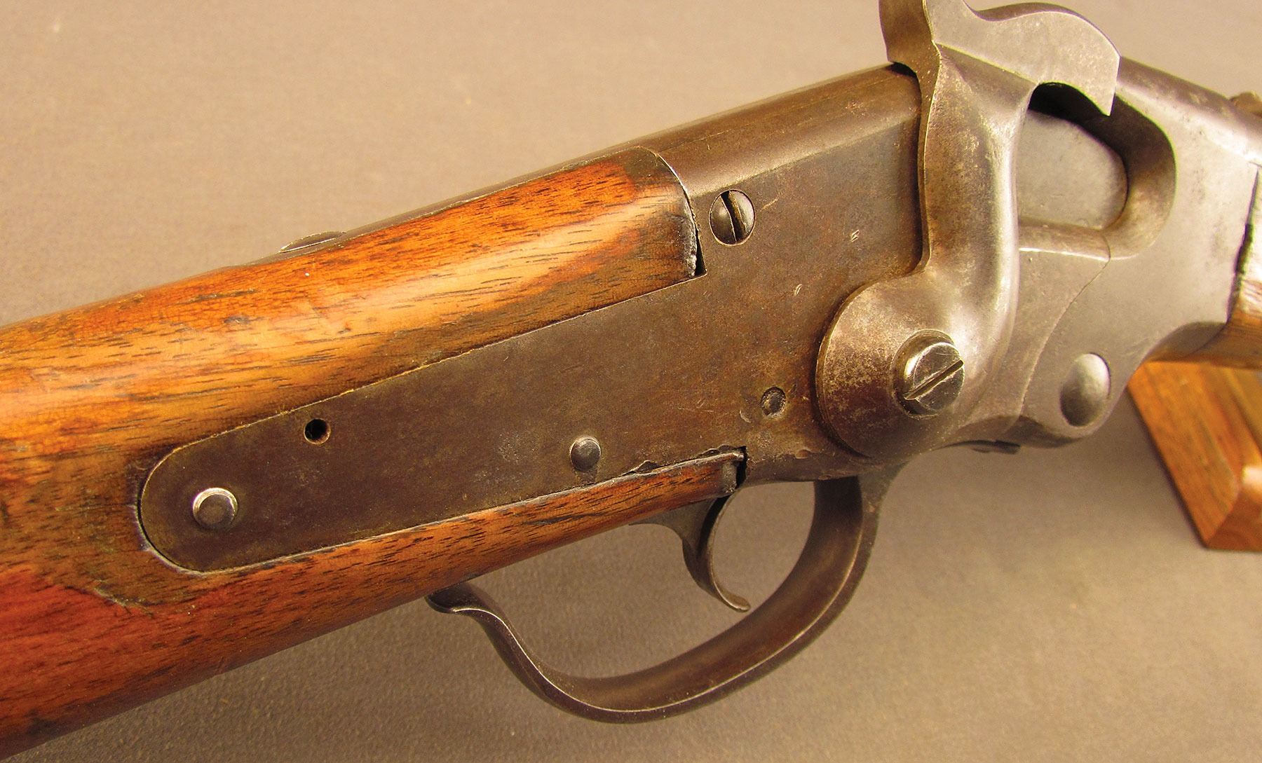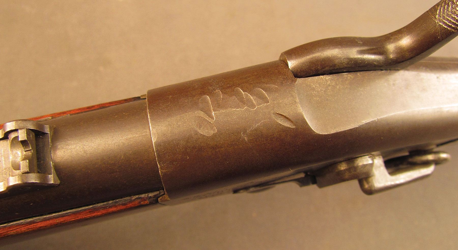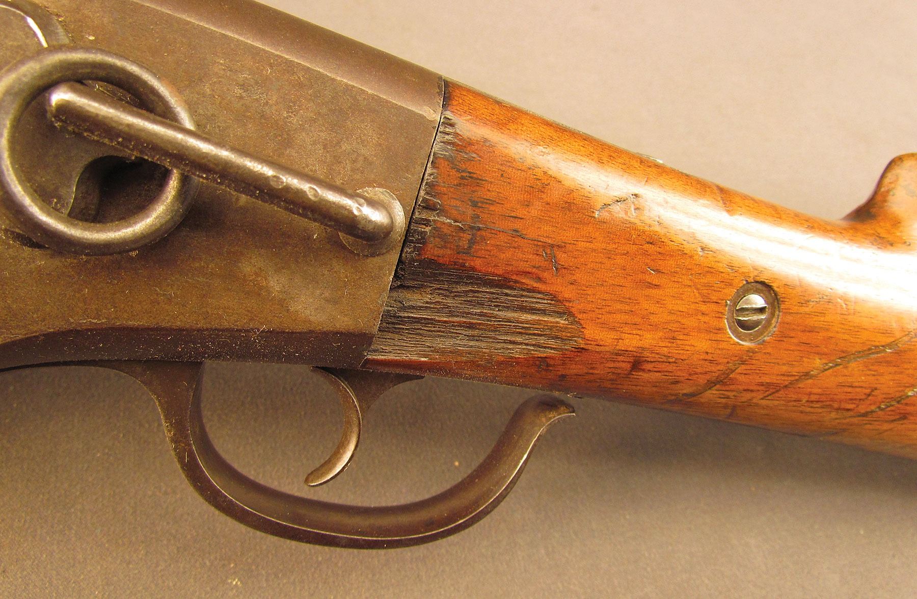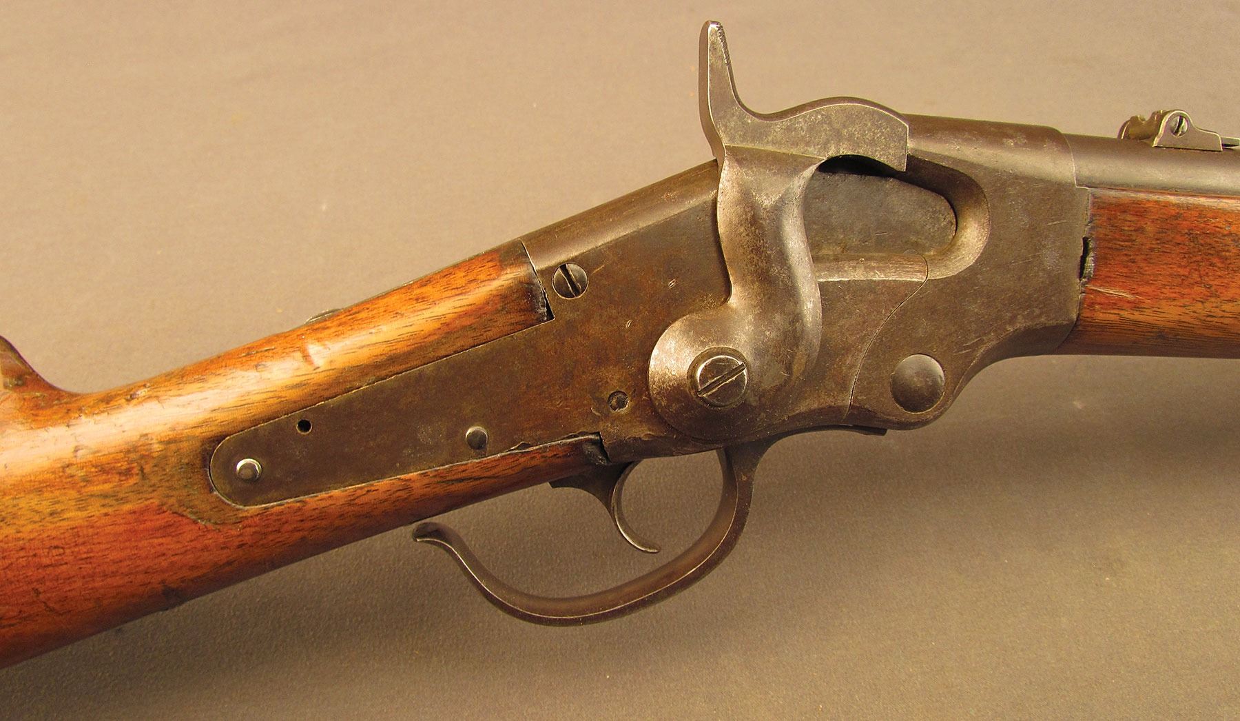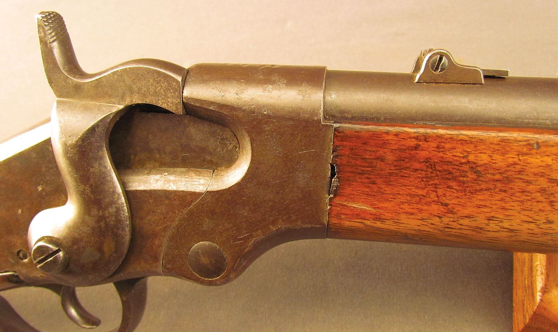 Civil War Ball Cavalry Carbine, one of 1,002 produced, no serial number, .50 RF, 20 1/2? barrel with a very good bore that has some light freckling and pitting within the grooves. This is a seldom seen carbine that has an overall dark plum-brown patina with some traces of mild gray on the hammer and right side of the frame and bolt. Additionally, there is a series of peen marks along the top of the receiver and lower edge of the sideplate just behind the hammer. The magazine cut-off on the left side and the triggerguard/lever pin retain about 90% of an added blue finish with mild gray fading on the balance. The "US" and Lamson & Co markings on the left side are still quite clear. The walnut forend and buttstock have an added varnish finish over numerous small handling marks and surface blemishes throughout with a further sizable chip missing from the left side of the wrist. The carbine comes with an original ramrod and the action is fully functional. These carbines were ordered in 1864 but weren't delivered until May of 1865 after hostilities had ceased (1,002 produced). Nevertheless, they are considered a secondary Civil War weapon and are seldom seen today. This example is in very good condition and would make a great addition to any collection.