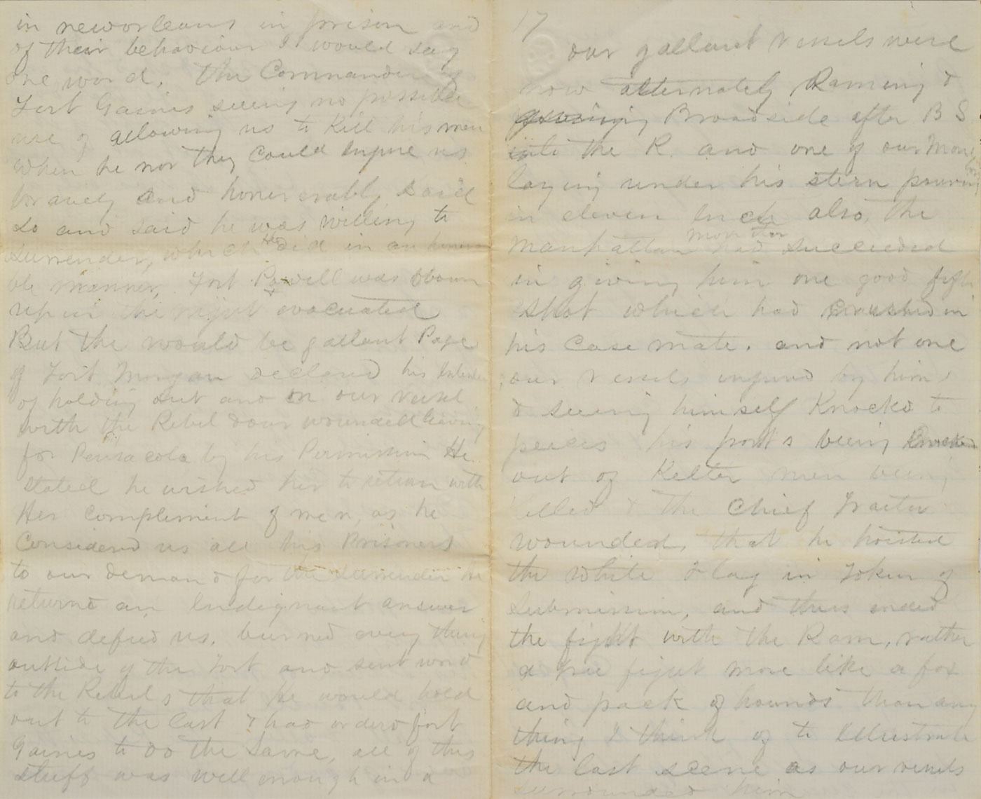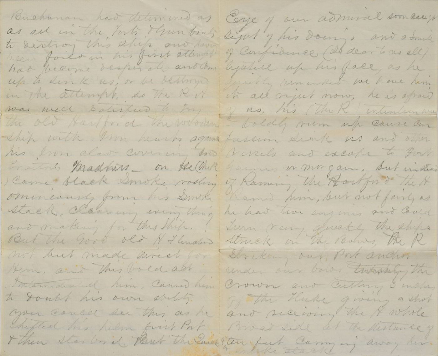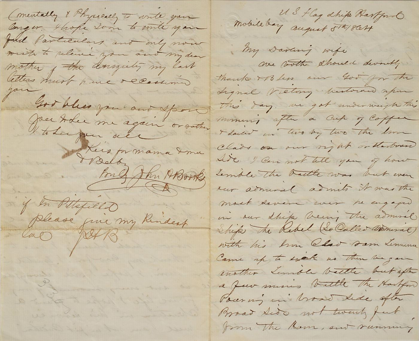 Extraordinary ALS signed “John H. Brooks,” 24 total pages on a set of six 5 x 8 sheets, lightly lined, (the first 11 pages in ink, the balance in graphite) August 5, 1864. An incredible firsthand account of John Brooks, the steward of Admiral David Farragut, written while aboard the flagship US Hartford during the Battle of Mobile Bay. The first four pages consist of a letter Brooks addressed to his wife on the day of battle, in part: "We got underweigh this morning after a cup of coffee and sailed in two by two the iron clads on our right or starboard side. I cannot tell you of how terrible the battle was but even our admiral admits it was the most severe ever we engaged in our ship being the admiral ship the Rebel…Tennessee came up to sink us then began another battle the Hartford pouring in broadside after broadside not twenty feet from the ram and running into her nearly sinking her…we lost over twenty men killed and wounded cut up in a manner most shocking…we are now in the Bay of Mobile and will try to compel the forts guarding its entrance to surrender after which we will be ready for home…I hope you will soon read this letter which we plan to send tonight, which if captured by the enemy will serve him in showing the deprived the best of wives a letter that would relieve her aching heart. Oh, this fighting was terrible but I was never more cool…I hope soon to write you full particulars and only now wish to relieve you and my dear mother of the anxiety of my last letters."
