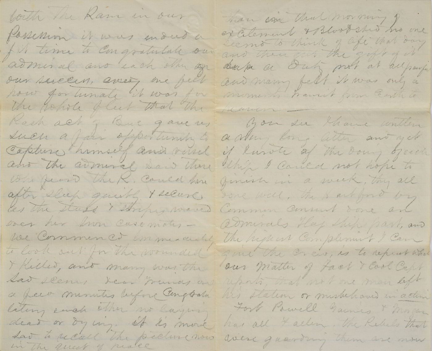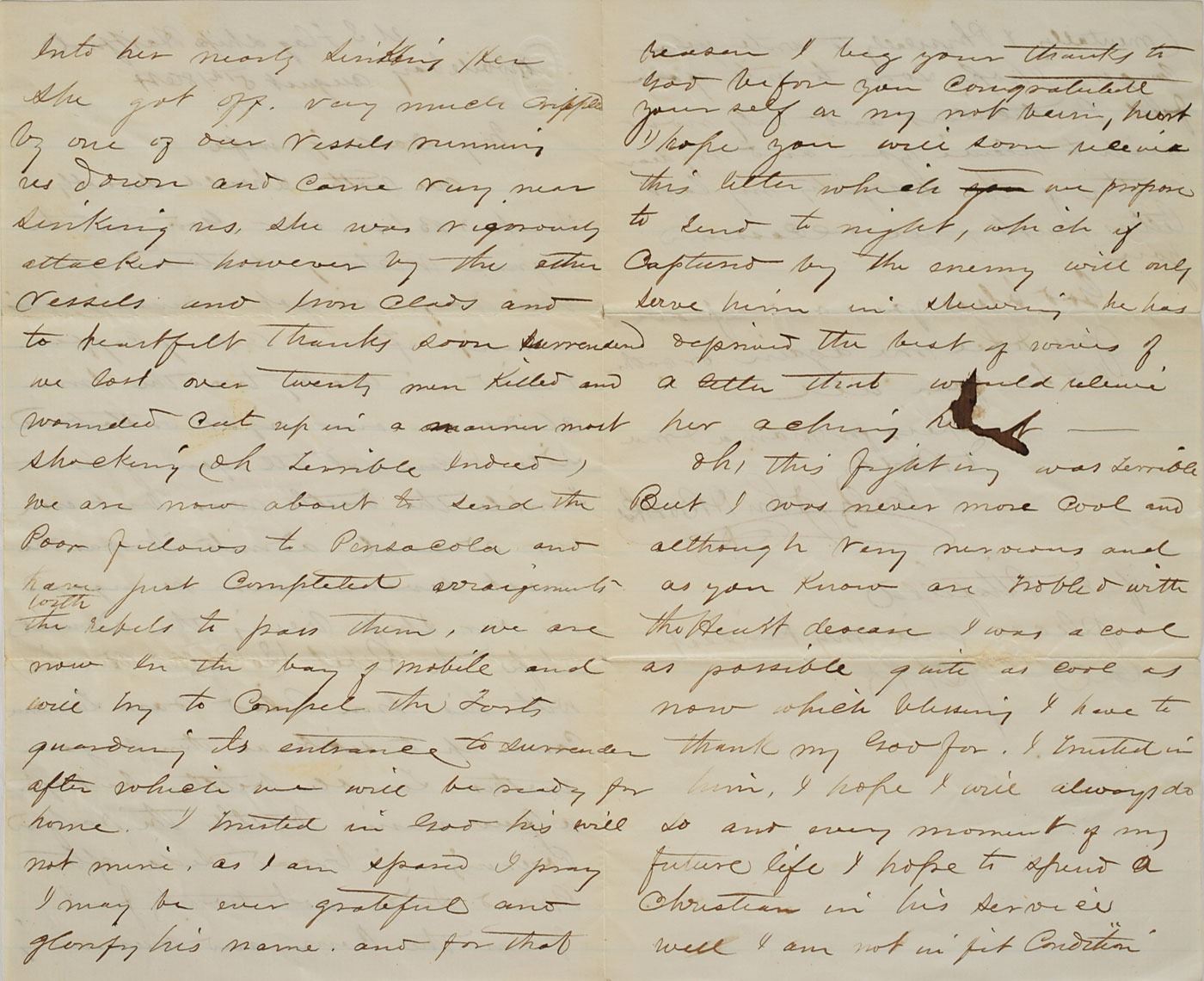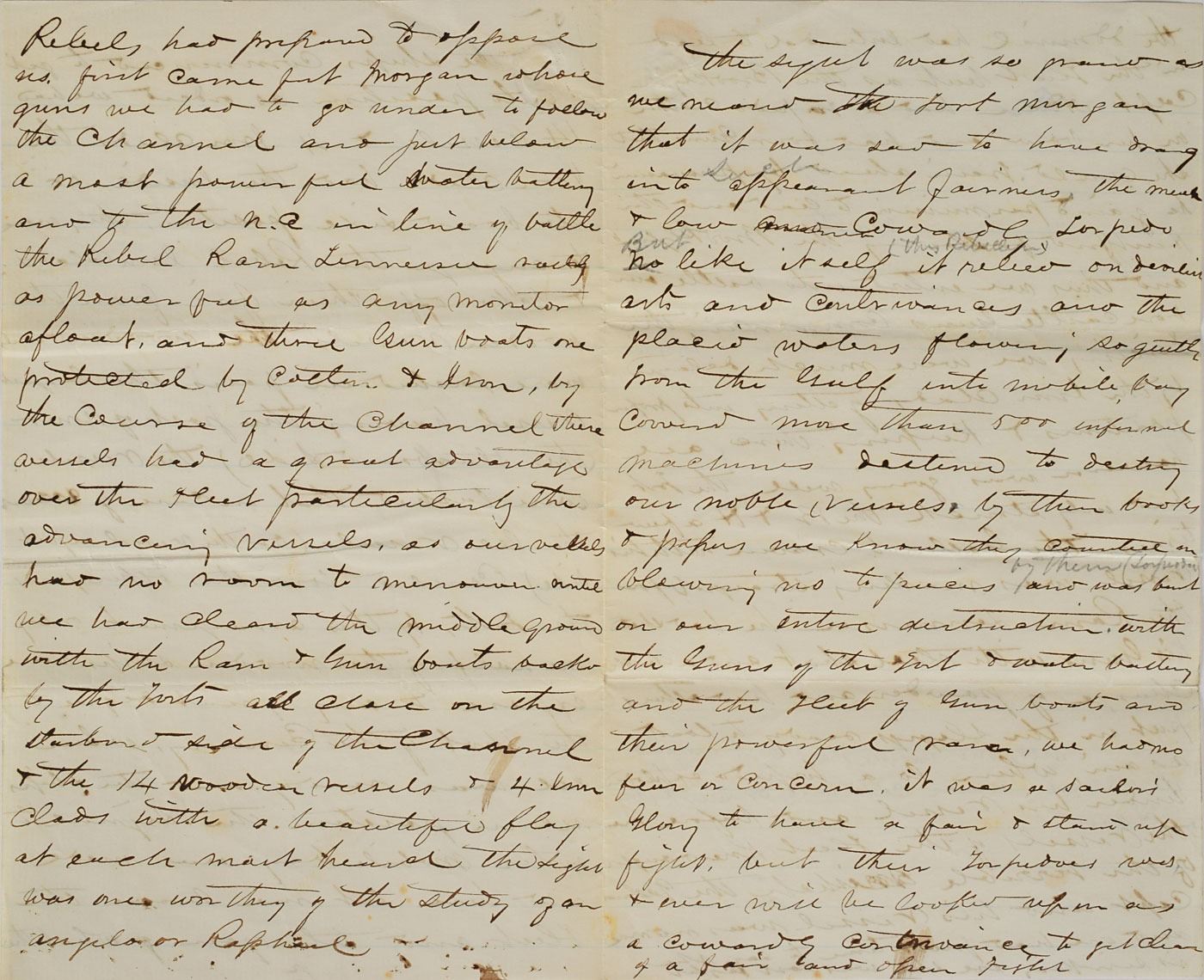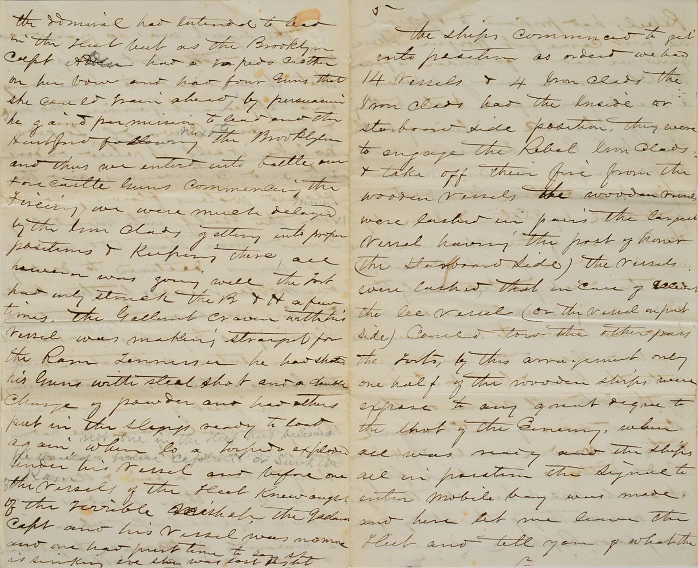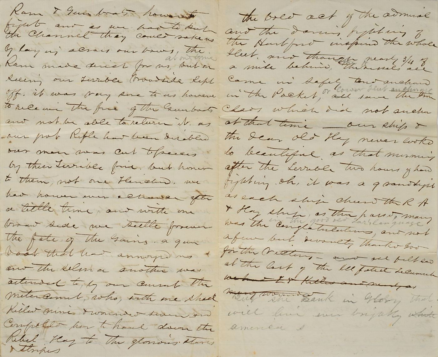 The remaining pages represent a moment-by-moment eyewitness retelling of the engagement, in part: "As ordered we had 14 vessels and 4 Iron Clads. The Iron Clads had the inside or starboard side position, they were to engage the Rebel Ironclads…The Gulf into Mobile Bay covered more than 500 infernal machines destined to destroy our noble vessels, by their books and papers we know they counted on blowing us to pieces…but their torpedoes was and ever will be looked upon as a cowardly contrivance to get clear of a fair and open fight and the Admiral had intended to lead in the fleet but as the Brooklyn Capt Alden had a torpedo cutter on her blow and had four funs that she could train ahead by persuasion he gained permission to lead.” At this juncture, the seemingly impregnable monitor Tecumseh, in an effort to keep the approaching CSS Tennessee in view, steered into a minefield, struck a torpedo, and sunk in less than a minute. “The Gallant Capt. [Tunis Craven] and his vessel was no more and one had just time to say she is sinking ere she was lost sight seeing this and supposing his ships running on to a nest of there terrible machines the Gallant Alden hesitated backed his vessel and stood aghast.” Peril and confusion prompted the USS Brooklyn, which led the second column, to halt and Captain James Alden to request orders before moving ahead. Determined to keep his flagship in forward momentum, Farragut ordered the Hartford around Brooklyn and into the minefield with his famous order of ‘Damn the torpedoes.’ His gamble that the submerged torpedoes would be of no consequence proved correct, and erelong his fourteen warships passed through unmolested. “Everyone asked why does the B [Brooklyn] stop, and I am sure disaster would have followed if the Gallant Admiral had not asked if there was room to pass the Brooklyn & on being answered in the affirmative gave the order for the H to steam ahead and gaily was the order executed and the Rebels soon left their guns and we cared nothing further from the fort & battery.” Brook proceeds to detail the succeeding hours of combat between Union forces and the Confederate Navy: “The Metacomet who with one shot killed nine and wounded seven and compelled her to haul down the rebel flag to the glorious Stars And Stripes, the bold act of the admiral and the daring fighting of the Hartford inspired the whole fleet…The Dear Old Flag never looked so beautiful as that morning after the terrible two hours of hard fighting. Oh it was a grand sight…Our gallant vessels were now alternately ramming and pouring broad side after BS…The Manhattan had succeeded in giving him one good fifteen shot which crushed in his casement and not one of our vessels being injured by him…The ships steaming in opposite directions passed each other and the rest of the fleet took up the fight. The H rounded and made for the R[am] again but other of our vessels were bent on the same thing and unfortunately one ran into us knocking two ports into one and cutting our side down to the waters edge…our gallant vessels were now alternately ramming & pouring broadside after BS into the R and one of our monitors laying under his stern pouring in eleven inch also, the Manhattan had succeeded in giving him one good fifteen shot which crushed in his casement and not one of our vessels injured by him & seeing himself knocked to pieces his ports being knocked out of kilter men being killed & the chief traitor wounded that he hoisted the white flag in token of submission, and thus ended the fight with the Ram. Rather a free fight more like a fox and pack of hounds than anything…We commenced immediately to look out for the wounded and killed…in the quiet of peace than in that morning of excitement and bloodshed, no one seemed to think of life that day and then get the gift of it but a duty not all painful and many felt it was only a moments transit from Earth To Heaven…We are now therefore in complete possession of Mobile Bay…Thanks to God for the Victory." In fine condition. An exhaustive, endlessly fascinating account of the Battle of Mobile Bay.