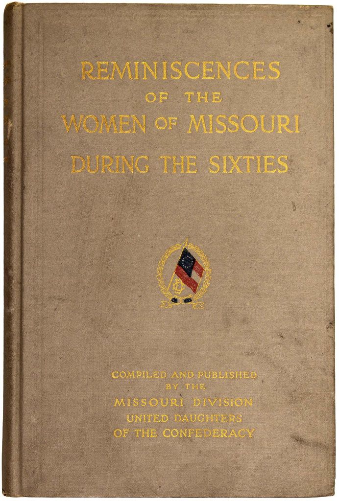 Reminiscences of the Women of Missouri During the Sixties compiled by the Missouri Division, United Daughters of the Confederacy: Mrs. Blake Woodson, First Chairman, Mrs. G. W. Hyde, Second Chairman, and Mrs. Matilda Wedemeyer Gantt, Publication Chairman. A collection of memories and writings from women and men involved in the Civil War from the Southern viewpoint. The United Daughters of the Confederacy was formed in 1894 and exists to this day. Little wear on cover and edges [Ref: hqudc.org].