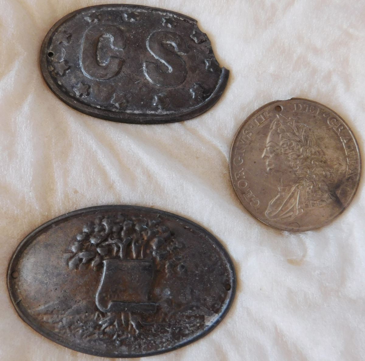 Civil War Buckle & Peace Medal Collection, circa 1860s. Made of pewter and nickel silver, this buckle measures 3 1/8". Eastern USA. Condition: One buckle has a nick on corner, some patina, see images. Shipping: $22.50.