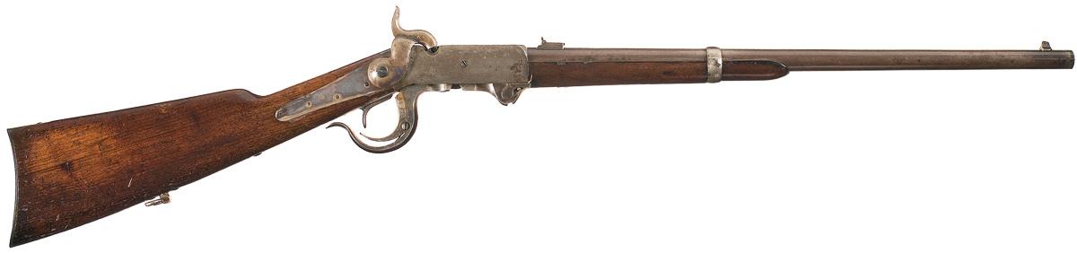 Purchased in quantity for use by the Federal Cavalry 1863-1864, the Burnside was very popular with the troops for it's accuracy and reliability. This is a 5th Model carbine, with the signature guide screw on the side of the frame, and corresponding groove in the breechblock. Top of chamber marked "BURNSIDE'S PATENT/ MARCH 25th 1856". Blade front and two leaf folding rear sight, with the latter numbered 1, 3 and 5, stamped "W" behind the rear sight and "CAST-STEEL 1864" between the rear sight and barrel band. There is a "D-C" stamp present on upper left side of receiver (significance unknown). Checkered hammer and sling bar running the full length of the left side, with single letter proofs on multiple components. Smooth straight grip stock, with a single barrel band, a pair of cartouches on the left wrist, sling swivel and a small letter proof on the breechblock.