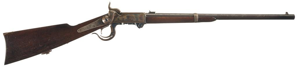 Manufactured 1863-1865. This Fifth Model carbine has the distinctive guide screw in the right side of the receiver. The top of the receiver is marked "BURNSIDE PATENT/MODEL OF 1864", "CAST STEEL 188?" (partially visible) ahead of the rear sight. There are "P", "M" and "R" inspection marks on various parts. Matching serial numbers. Pinched blade front sight and two leaf rear sight with graduations to 500 yards. A sling bar and ring are mounted on the left side of the receiver. The barrel had a dull military blue finish, the breech block, lever and receiver tangs niter blue, and the remaining parts are casehardened. Mounted with a smooth walnut forearm and straight grip stock with two sharp boxed cartouches on the left wrist and small inspection stamp on the comb just ahead of the buttplate tang and on the bottom of the forearm.