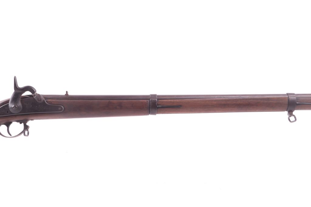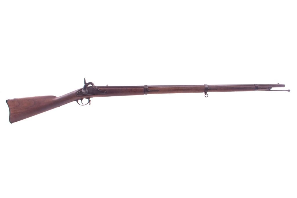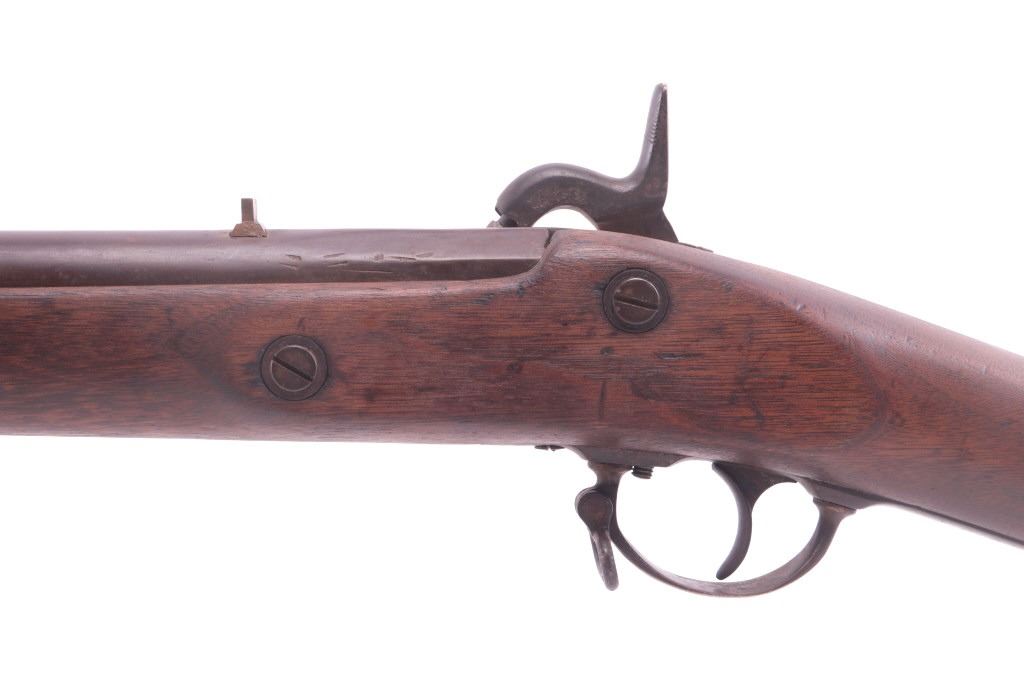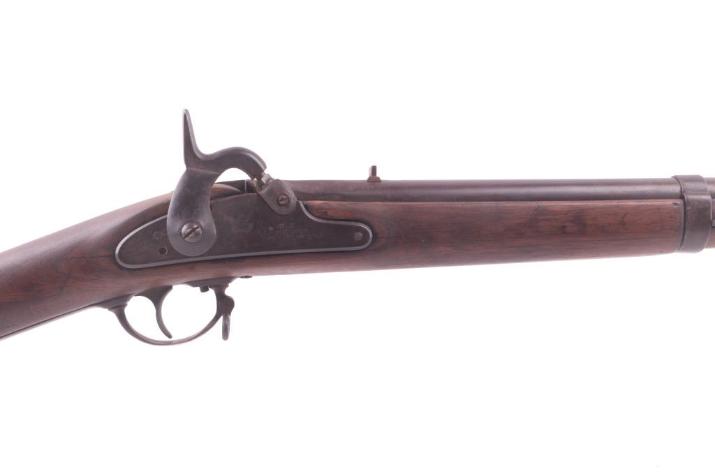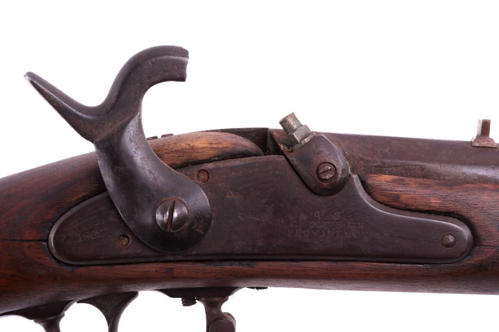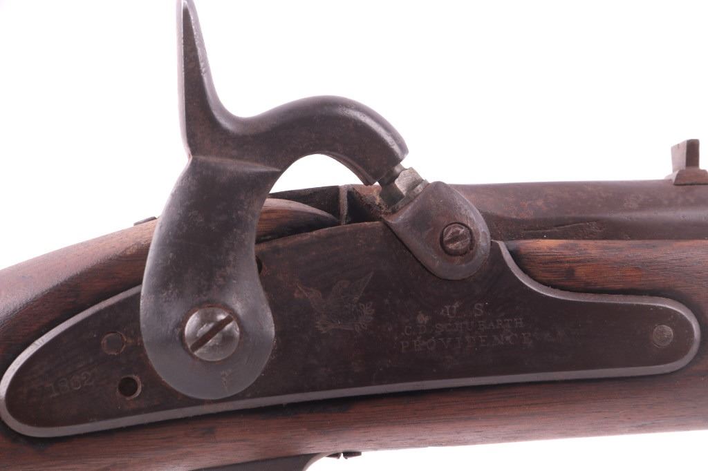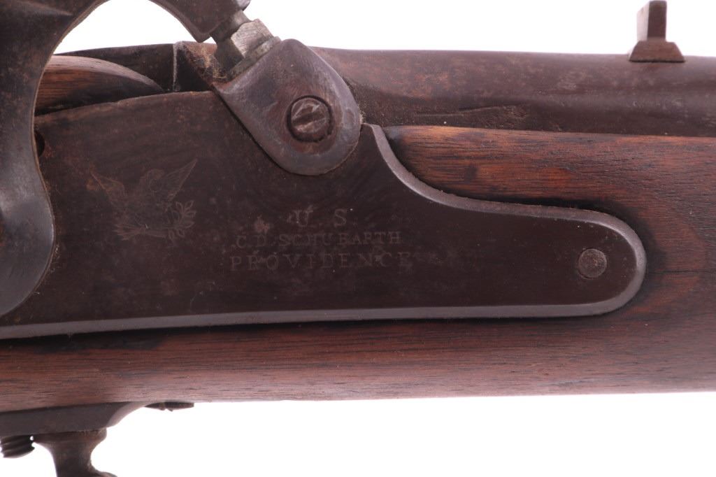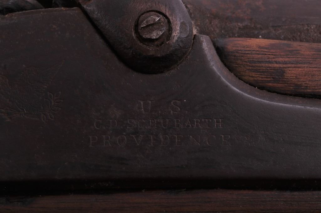 This is an immensely scarce and unusual C.D. Schubarth Model 1861 U.S. Civil War musket. This is one of only 500 known “U.S. / C.D. Schubarth / Providence (with Spread-Winged Eagle between the hammer and bolster) marked Civil War Model 1861 muskets to exist as documented by author and historian George Moller. This is a musket with an unusual and scandalous history including an immigrant, bribes, Congressional subpoenas, shame and eventual a failed business. The musket is dated on the lock plate 1862, along with the Spread-Winged Eagle between the hammer and bolster and under the bolster in three lines “U.S. C.D. Schubarth Providence”. It is also marked on the breech of the barrel “V/P”, on the flat of the left of the barrel breech “H”, “US” on the top flat of the original metal butte plate, and “U” on each of the three barrel bands. Casper Daniel Schubarth was born in Norway 1830 and apprenticed under a Norwegian gunsmith. He immigrated to the United States in 1850 and settled in Massachusetts, later opening a gunsmithing shop in Providence, Rhode Island in 1855. Schubarth brought on his brothers, Amos D. and James Y. Smith, as investors who later introduced him to Republican Rhode Island Senator James F. Simmons. He introduced his US Patent #32,895, an “Improvement in Breech-Loading Firearms”, which was turned down, and then bid to undertake the manufacture of US Model 1861 Rifle Muskets. Due to Senator Simmons, Schubarth received a contract for 20,000 US M1861 Rifle Muskets at $20 each, supposedly landing the contract due to Senator Simmons strong arming Secretary of War Cameron, who passed the order to General Ripley, who offered the contract to Schubarth on October 11, 1861, only one day after being denied for his breechloading design. The contract was a mixed blessing, as it was not large enough to cover the cost of tooling and production, so Schubarth’s partners pressured him to return to Washington and increase the contract to a more profitable number of arms. Schubarth, relying on Simmons’ help, obtained a larger contract for a total of 50,000 arms on November 26, 1861, along with an invoice from Simmons for $50,000, which Simmons considered his “commission”, an obvious illegal act. At this point, his brothers and financial backers considered this a bribe and abandoned the venture, leaving Schubarth with no investors and no ability to produce the arms and pay Simmons. James Smith, his brother had political aspirations himself and didn’t want the controversy ruining his career, which turned out to be a wise decision as he was elected the Governor of Rhode Island in 1862. On February 15, 1862, he formed the C.D. Schubarth & Company corporation with backing from new partners, James M. Ryder and Frederick Griffing. Simmons was so set on receiving his “commission” or bribe that he met with the new backers demanding his payment and left the meeting with two $10,000 promissory notes. Due to President Lincoln replacing Secretary of War Simon Cameron with Edwin Stanton and the Holt-Owens Commission Casper, Schubarth was subpoenaed before Congress. Schubarth, in his testimony, persuaded the elected officials to see that he entered into the morally incorrect, but not technically illegal, bribe agreement without nefarious intentions, blaming his foreign birth and lack of understanding for government procedure. They were much harder on Senator Simmons, who took advantage of a national emergency and an emigrant. President Lincoln signed a bill into law, which made accepting bribes from contactors as an illegal act punishable by prison and fine. Simmons resigned from the Senate. The order was decreased to 30,000 rifles, but Schubarth only delivered 500 by December 1862. There was another delivery of 950 in April of 1863 and a total of supposedly 9,500 between December 1862 and October 1863 (later finding that the number was likely lower as many of the firearms delivered were a 4th class of quality and rejected). Research by arms historian and author, George Moller, suggests that only about 500 of the Schubarth arms were delivered with C.D. Schubarth marked lock plates, with the balance of the guns being marked either by Providence Tool or Alfred Jenks and, later, Norwich Arms Company. Overall, this is an exceptionally rare example of US Model 1861 Rifle Musket by C.D. Schubarth, with an estimated 500 being marked as such and even fewer still inexistence today. With a total of slightly more than 448,000 contact US M1861 rifle muskets delivered by contractors between 1862 and 1865, the Schubarth produced guns represents only about 2% of all those guns and the C.D. Schubarth marked rifles only account for 00.1%, or 1/10th of 1%, making this one of the most scarce and storied Civil War Model 1861 muskets ever produced. A Schubarth example is missing from even some of the most advanced Civil War musket collections and museums and is sure to be the prize of any collection. This example shows dark metal blue coloring with crisp stamping and clean wood. The metal all appears to be the original bluing and patina (please use your own judgement for condition) and the wood appears to have been cleaned or refurbished over its 159-year age. The rifling has not been entirely inspected and is smoothed out. The firearm was tested and fired without a ball and was in functioning condition. NAAC makes no guarantee of the safety of shooting such an old firearm. Antique Firearm requires no FFL or NICS background check and can be shipped directly to buyer. The musket is accompanied with a Watervliet Arsenal stamped leather sling, a later addition.