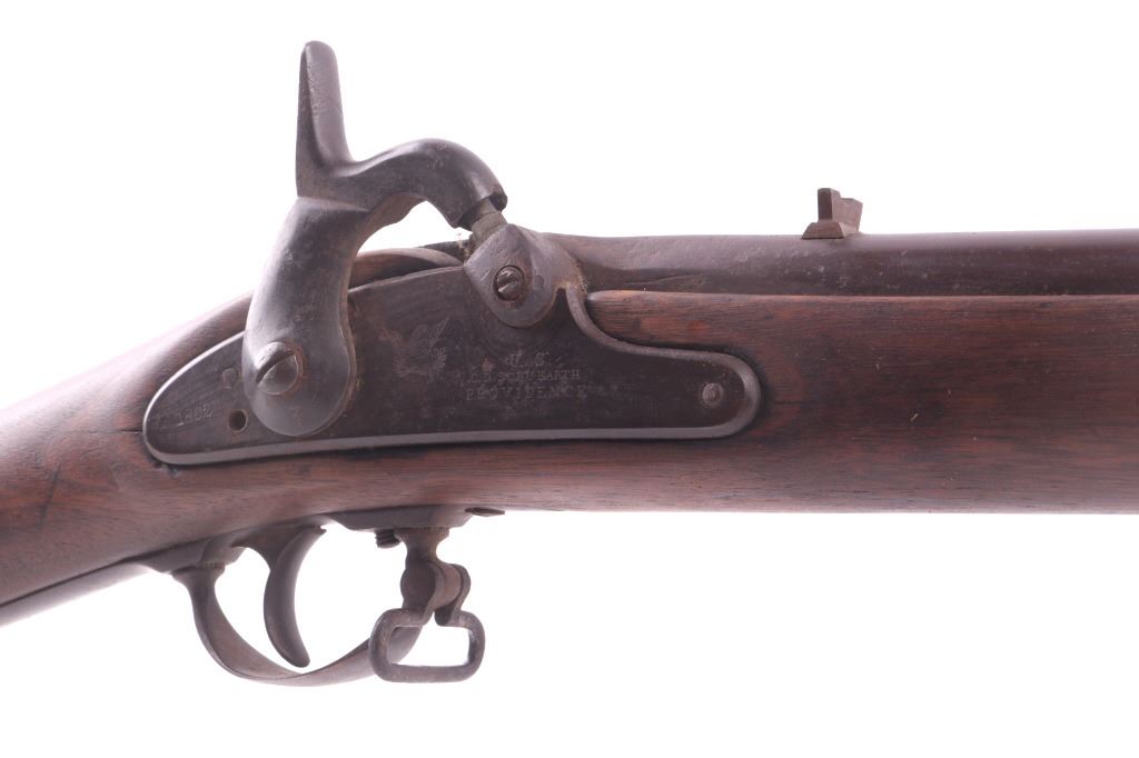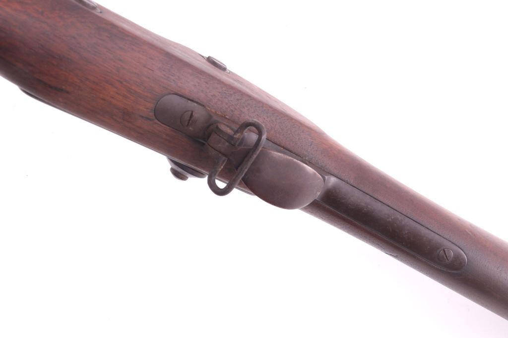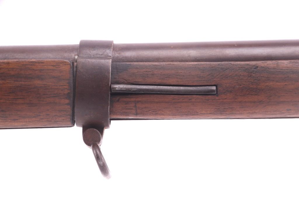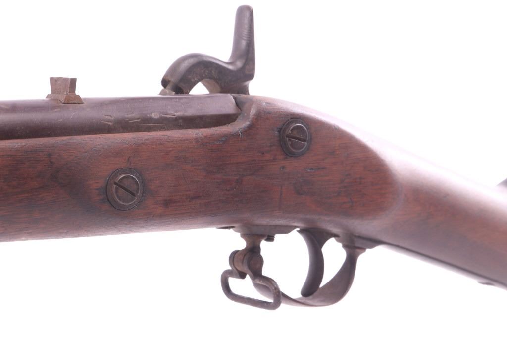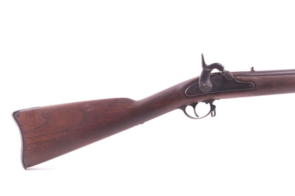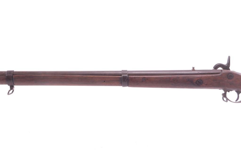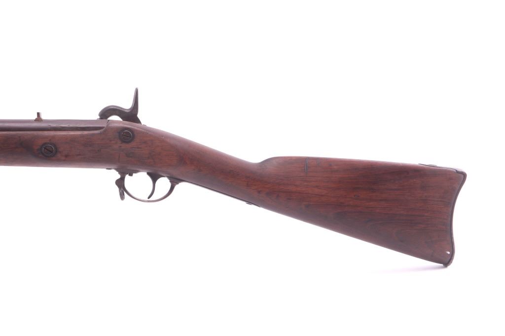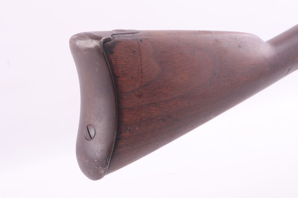 This is an immensely scarce and unusual C.D. Schubarth Model 1861 U.S. Civil War musket. This is one of only 500 known “U.S. / C.D. Schubarth / Providence (with Spread-Winged Eagle between the hammer and bolster) marked Civil War Model 1861 muskets to exist as documented by author and historian George Moller. This is a musket with an unusual and scandalous history including an immigrant, bribes, Congressional subpoenas, shame and eventual a failed business. The musket is dated on the lock plate 1862, along with the Spread-Winged Eagle between the hammer and bolster and under the bolster in three lines “U.S. C.D. Schubarth Providence”. It is also marked on the breech of the barrel “V/P”, on the flat of the left of the barrel breech “H”, “US” on the top flat of the original metal butte plate, and “U” on each of the three barrel bands. Casper Daniel Schubarth was born in Norway 1830 and apprenticed under a Norwegian gunsmith. He immigrated to the United States in 1850 and settled in Massachusetts, later opening a gunsmithing shop in Providence, Rhode Island in 1855. Schubarth brought on his brothers, Amos D. and James Y. Smith, as investors who later introduced him to Republican Rhode Island Senator James F. Simmons. He introduced his US Patent #32,895, an “Improvement in Breech-Loading Firearms”, which was turned down, and then bid to undertake the manufacture of US Model 1861 Rifle Muskets. Due to Senator Simmons, Schubarth received a contract for 20,000 US M1861 Rifle Muskets at $20 each, supposedly landing the contract due to Senator Simmons strong arming Secretary of War Cameron, who passed the order to General Ripley, who offered the contract to Schubarth on October 11, 1861, only one day after being denied for his breechloading design. The contract was a mixed blessing, as it was not large enough to cover the cost of tooling and production, so Schubarth’s partners pressured him to return to Washington and increase the contract to a more profitable number of arms. Schubarth, relying on Simmons’ help, obtained a larger contract for a total of 50,000 arms on November 26, 1861, along with an invoice from Simmons for $50,000, which Simmons considered his “commission”, an obvious illegal act. At this point, his brothers and financial backers considered this a bribe and abandoned the venture, leaving Schubarth with no investors and no ability to produce the arms and pay Simmons. James Smith, his brother had political aspirations himself and didn’t want the controversy ruining his career, which turned out to be a wise decision as he was elected the Governor of Rhode Island in 1862. On February 15, 1862, he formed the C.D. Schubarth & Company corporation with backing from new partners, James M. Ryder and Frederick Griffing. Simmons was so set on receiving his “commission” or bribe that he met with the new backers demanding his payment and left the meeting with two $10,000 promissory notes. Due to President Lincoln replacing Secretary of War Simon Cameron with Edwin Stanton and the Holt-Owens Commission Casper, Schubarth was subpoenaed before Congress. Schubarth, in his testimony, persuaded the elected officials to see that he entered into the morally incorrect, but not technically illegal, bribe agreement without nefarious intentions, blaming his foreign birth and lack of understanding for government procedure. They were much harder on Senator Simmons, who took advantage of a national emergency and an emigrant. President Lincoln signed a bill into law, which made accepting bribes from contactors as an illegal act punishable by prison and fine. Simmons resigned from the Senate. The order was decreased to 30,000 rifles, but Schubarth only delivered 500 by December 1862. There was another delivery of 950 in April of 1863 and a total of supposedly 9,500 between December 1862 and October 1863 (later finding that the number was likely lower as many of the firearms delivered were a 4th class of quality and rejected). Research by arms historian and author, George Moller, suggests that only about 500 of the Schubarth arms were delivered with C.D. Schubarth marked lock plates, with the balance of the guns being marked either by Providence Tool or Alfred Jenks and, later, Norwich Arms Company. Overall, this is an exceptionally rare example of US Model 1861 Rifle Musket by C.D. Schubarth, with an estimated 500 being marked as such and even fewer still inexistence today. With a total of slightly more than 448,000 contact US M1861 rifle muskets delivered by contractors between 1862 and 1865, the Schubarth produced guns represents only about 2% of all those guns and the C.D. Schubarth marked rifles only account for 00.1%, or 1/10th of 1%, making this one of the most scarce and storied Civil War Model 1861 muskets ever produced. A Schubarth example is missing from even some of the most advanced Civil War musket collections and museums and is sure to be the prize of any collection. This example shows dark metal blue coloring with crisp stamping and clean wood. The metal all appears to be the original bluing and patina (please use your own judgement for condition) and the wood appears to have been cleaned or refurbished over its 159-year age. The rifling has not been entirely inspected and is smoothed out. The firearm was tested and fired without a ball and was in functioning condition. NAAC makes no guarantee of the safety of shooting such an old firearm. Antique Firearm requires no FFL or NICS background check and can be shipped directly to buyer. The musket is accompanied with a Watervliet Arsenal stamped leather sling, a later addition.