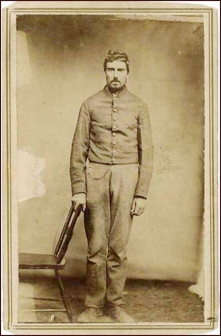 CW CDV of uniformed soldier in full standing pose. Edges have been trimmed down. Union soldier stands, seemingly hunched, with his hand resting on back of chair. Some paper loss on left side of image does not detract from image. Some minor paper loss on back. No backmark. Good image over all with great contrast. Good condition.