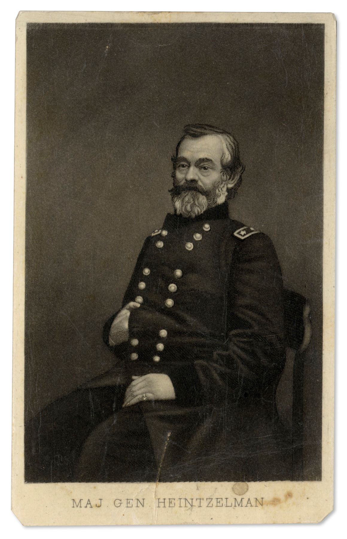 Civil War carte de visite photograph of Union Major General Samuel Heintzelman. Published from an engraving, CDV measures 2.5'' x 4''. No backmark. Very good condition.