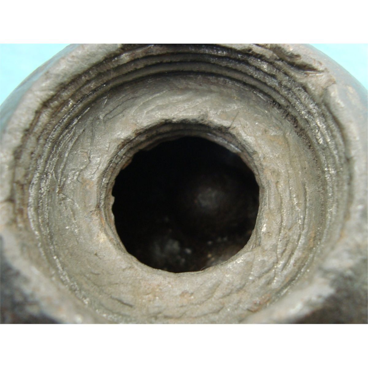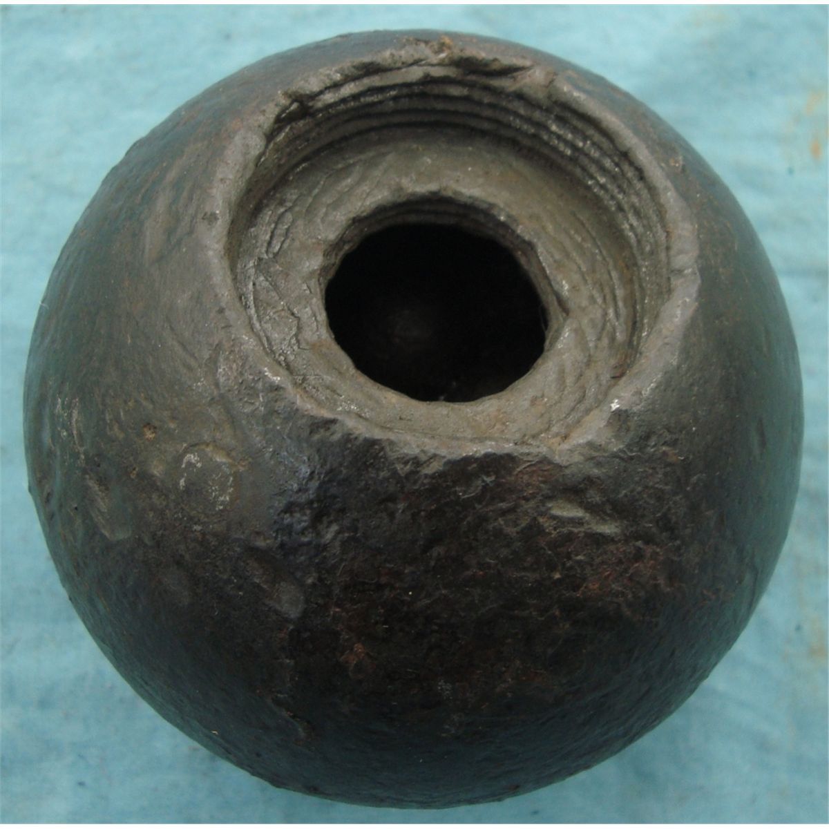 Ball measures approx. 3 1/2" in diameter w/threaded fuse removed. Showing reminance of grape shot.