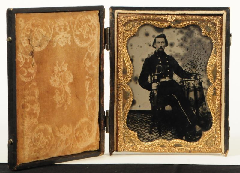 Tintype Photograph of Man in Military Uniform, in folding case, Photo measures 4" x 3" Case measures 4 3/4" x 3 1/2"