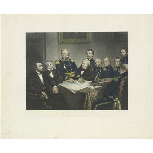 <B>Civil War Engraving: "A Council of War in '61"</B></I> <I>The President's House, Washington, D.C., President Lincoln and Members of His Cabinet in Council with Lieut. Gen. Scott and Prominent Officers of the Army.</B></I> Colored steel engraving from the painting by H. B. Hall, published by George B. Perine of New York in 1866. Image size is 15. 1/2" x 12", matted to overall size of 24" x 22", fine condition. In the engraving, Lincoln and Scott are joined by William Seward, George McClellan, Benjamin Butler, John Wool, John Dix, John C. Fremont, and others. Winfield Scott and the other generals are all in full dress uniform.<BR><BR><b>Shipping:</b> Miscellaneous Collectibles, Smal (<a target="_blank" href="http://www.heritageauctions.com/common/shipping.php">view shipping information</a>)