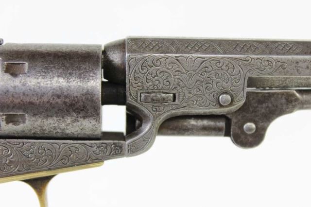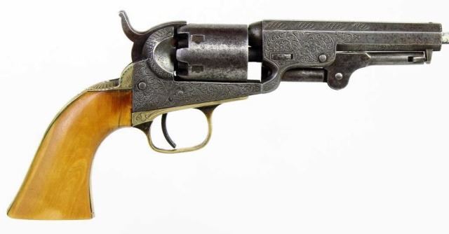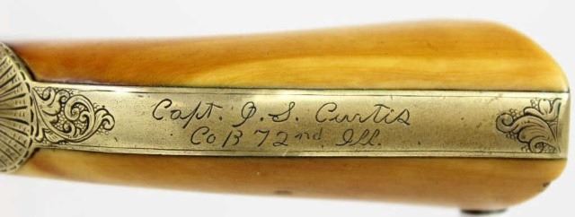 Civil War Colt 1849 .31 cal. SN 25XXXXrevolver, made in 1864, engraved and inscribed on backstrap to Capt. J.S. Curtiss Co. B 72nd Ill. the revolver shows about 3/4 engraved scroll coverage with 4" barrel, ivory grips, all visible serial numbersmatching including loading lever and wedge, the steel surfaces show gray overall patina, ivory grips toned to a natural dark patina, all standard markings are crisp, mechanically tight, timing and lockup excellent, includes old research and military records on Capt. Curtiss, documenting his service beginning in 1862 at the age of 28, fought at the siege of Vicksburg, mustered out in 1864, and died in the Illinois Hospital for the Insane in1894. From John Hunter Collection. Antique. Est. 3000-6000