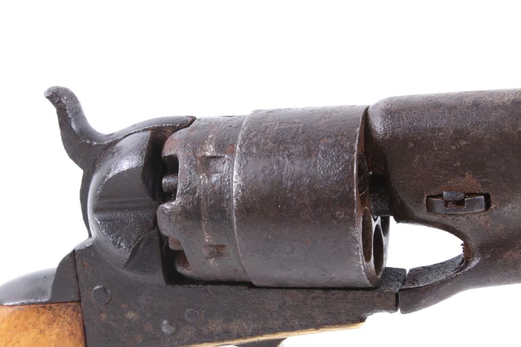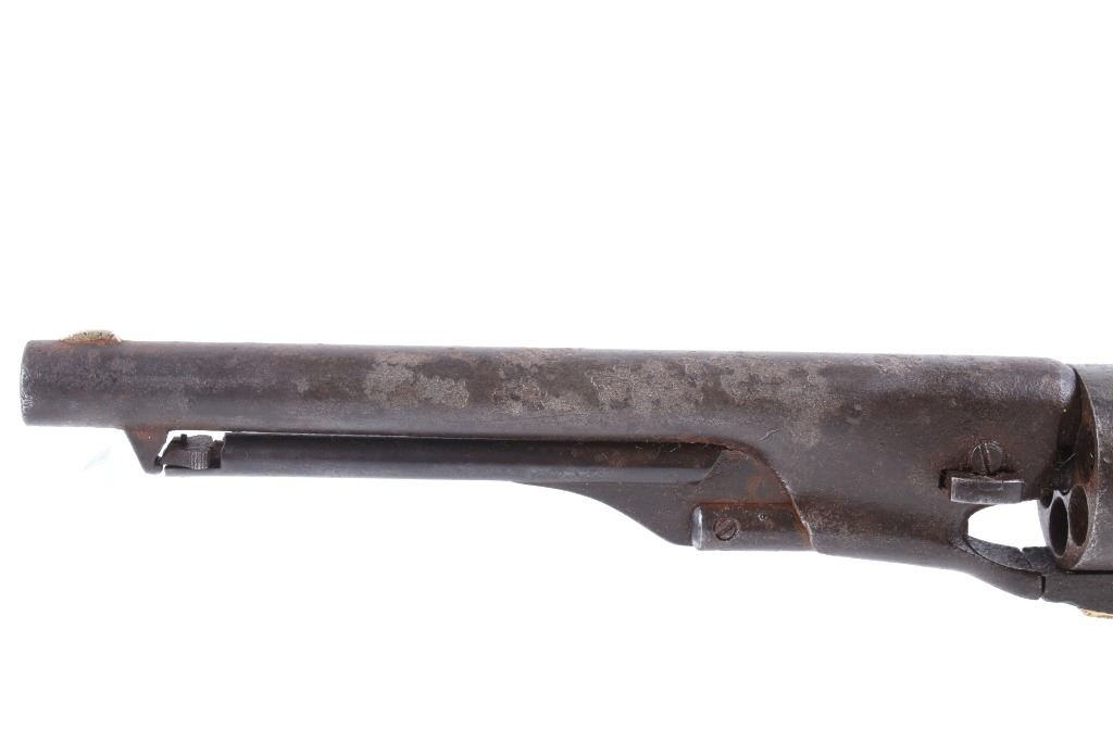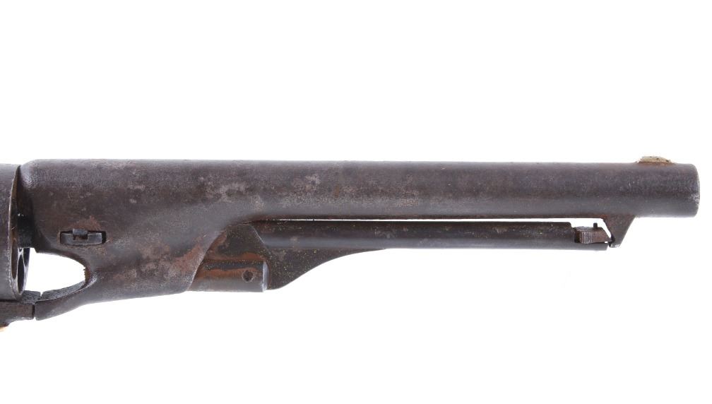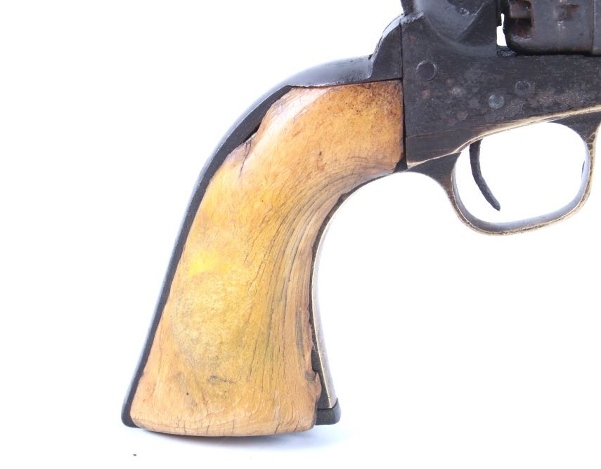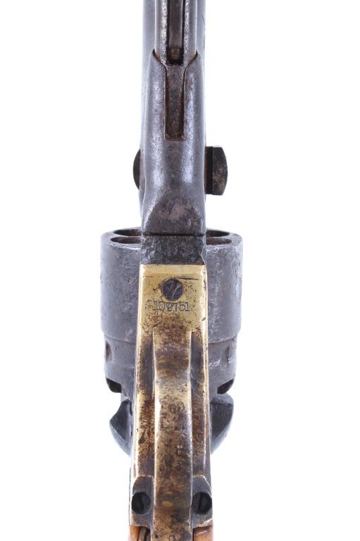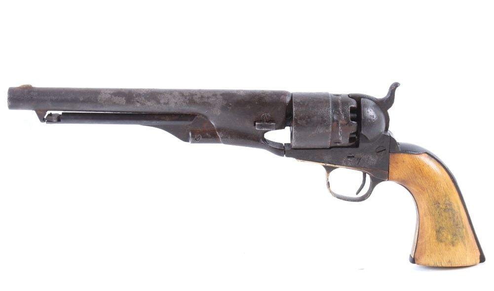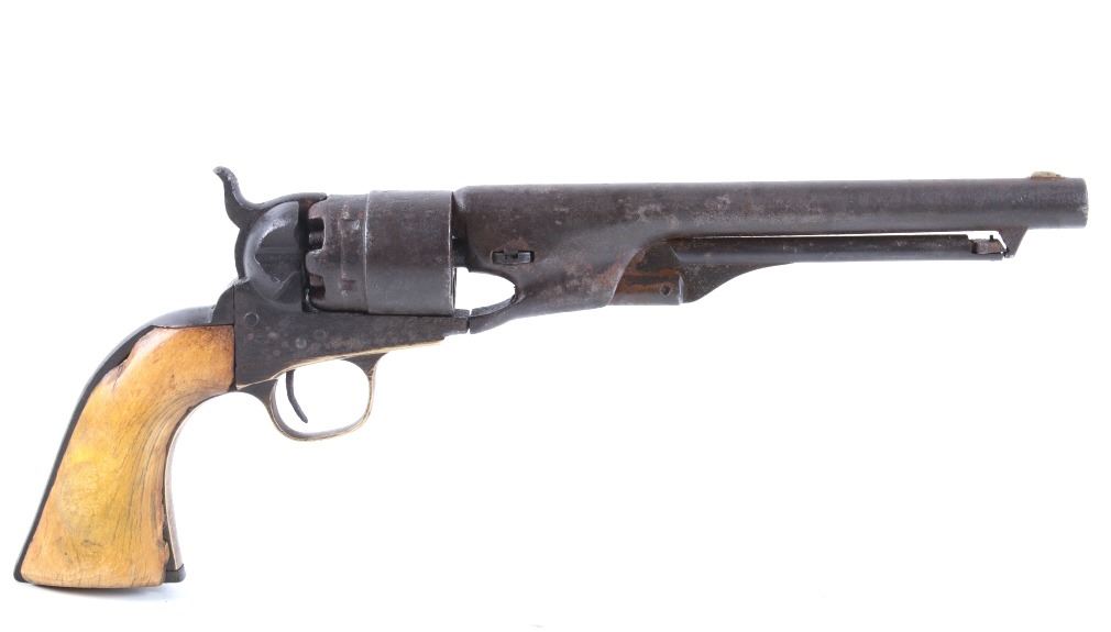 Offered for sale is a rare Colt 1860 Army percussion .44 caliber revolver. This revolver features an 8" barrel, brass trigger guard, and deluxe ivory handles. This was one of the most widely issued and popular of the Civil War revolvers with many, if not most, going to the West after the war for Indian Wars or frontier service. Overall, it displays an attractive deep aged patina with no evidence of having been buffed, polished, steel-wooled or cleaned. Correct 8” barrel with correct small front sight, attached loading lever functions correctly, one piece ivory grips fully intact and in good overall condition. This handsome revolver no doubt saw long service in the Civil War, and into the Indian Wars yet remains today in good condition with functional mechanics. This classic cowboy gun was found in Montana proving its westward expansion. This revolver has a manufacture date of 1863. Serial Number: 109751. This firearm qualifies as an Antique, and does not require FFL Transfer or NICS Background Check.